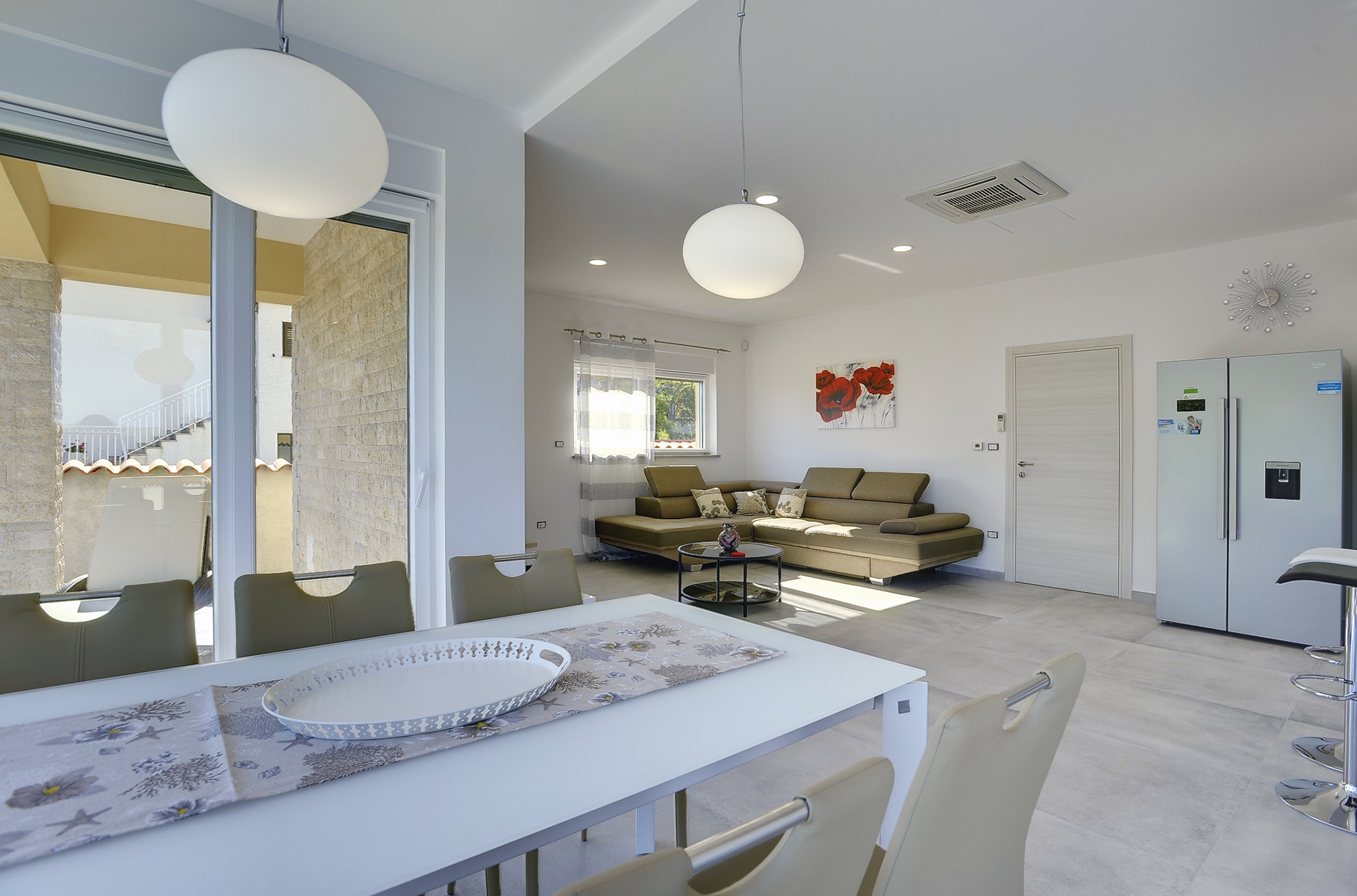 Dom może przyjąć 6 gości. Łóżka znajdują się w sypialniach, których jest 2, oraz w pokoju dziennym, na powierzchni 114m2. Goście mają dostęp do tarasu, by korzystać z ciepłych, letnich wieczorów. Z domu wakacyjnego roztacza się widok na morze. Grill jest dostępny tylko do użytku gości z tej kwatery. W trakcie swojego pobytu goście mogą zrelakswować się w prywatnym basenie. W rezerwowanej kwaterze na miejscu jest pobierana kaucja (jej wysokość jest podana na stronie). WLICZONE W CENĘ: taksa pobytowa, sprzątanie końcowe, klimatyzacja, basen, parking, garaż, internet, łóżeczko dziecięce, suszarka do włosów. OBOWIĄZKOWE KOSZTY DODATKOWE: depozyt (250,00 € jednorazowo). Dostępność dodatkowych usług w rezerwowanym terminie oraz ich cenę (jeśli nie jest podana) należy sprawdzić wcześniej. Za dodatowe usługi, które nie zostały uwzględnione w kalkulacji ceny, płaci się bezpośrednio właścicielowi obiektu, pod warunkiem śe gość korzysta z tych usług.