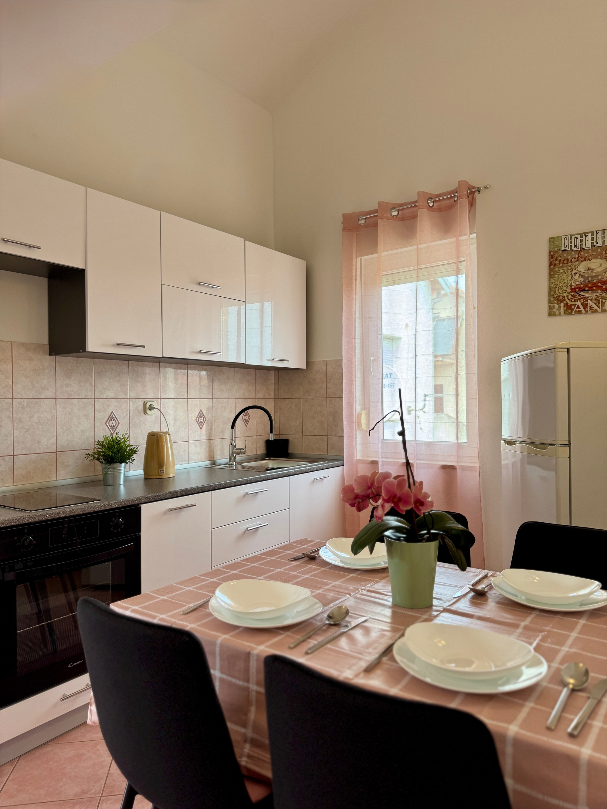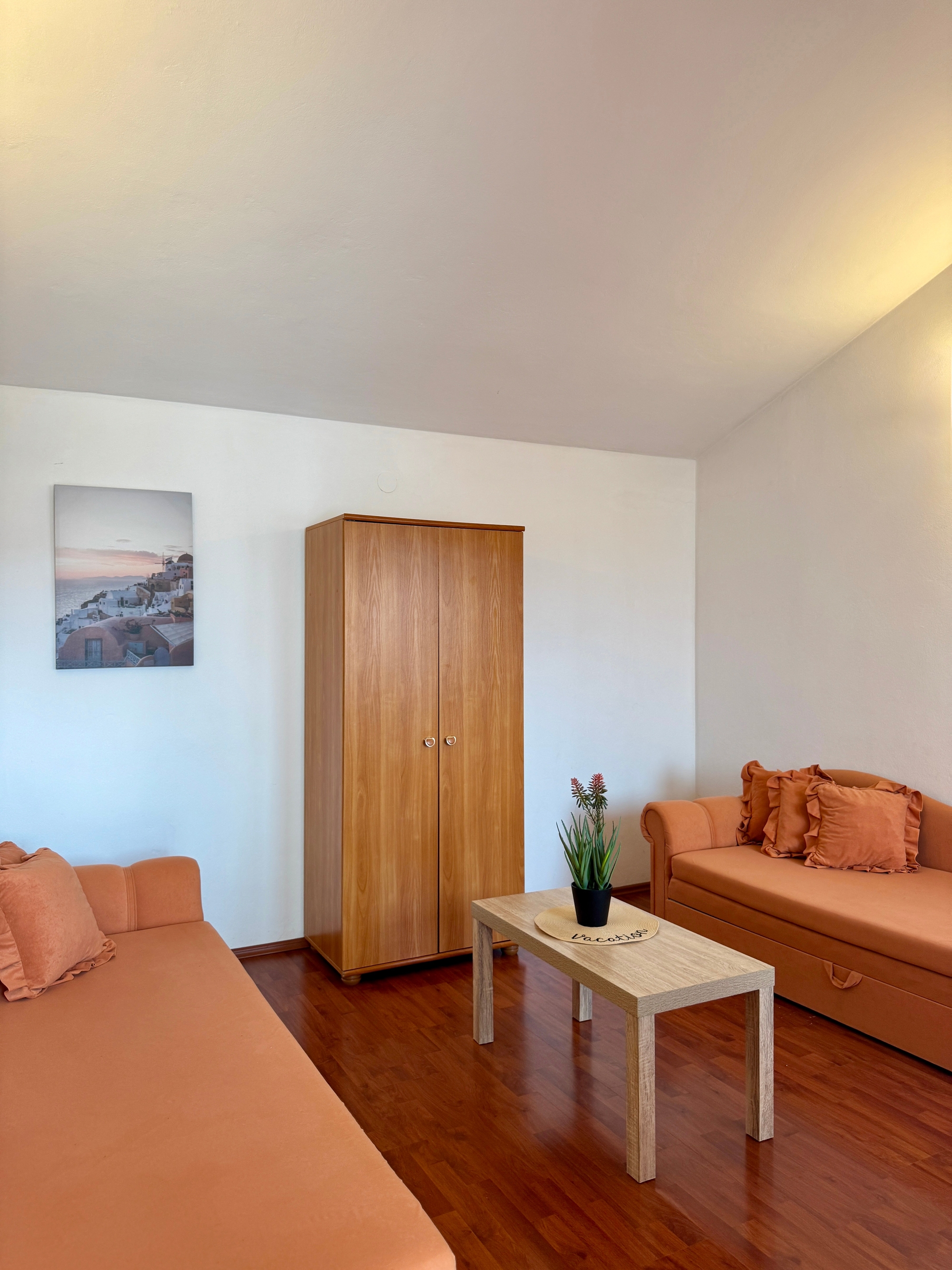 Apartament może przyjąć 4 gości. Łóżka znajdują się w sypialniach, których jest 1, oraz w pokoju dziennym, na powierzchni 42m2. Goście mają dostęp do balkonu, by korzystać z ciepłych, letnich wieczorów. Możliwość przygotowywania posiłków poprzez korzystanie ze wspólnego grilla. W kwaterze dozwolony jest pobyt zwierzęcia domowego, za dopłatą. WLICZONE W CENĘ: taksa pobytowa, sprzątanie końcowe, klimatyzacja, parking, internet, łóżeczko dziecięce, żelazko, deska do prasowania, suszarka do włosów, przenośny grill. OBOWIĄZKOWE KOSZTY DODATKOWE: dopłata za krótki termin (procent dopłaty w zalezności od liczby noclegów: 30% - 1, 20% - 2, 10% - 3). NIEOBOWIĄZKOWE KOSZTY DODATKOWE: zwierzęta domowe (5,00 € za nocleg). Dostępność dodatkowych usług w rezerwowanym terminie oraz ich cenę (jeśli nie jest podana) należy sprawdzić wcześniej. Za dodatowe usługi, które nie zostały uwzględnione w kalkulacji ceny, płaci się bezpośrednio właścicielowi obiektu, pod warunkiem śe gość korzysta z tych usług.