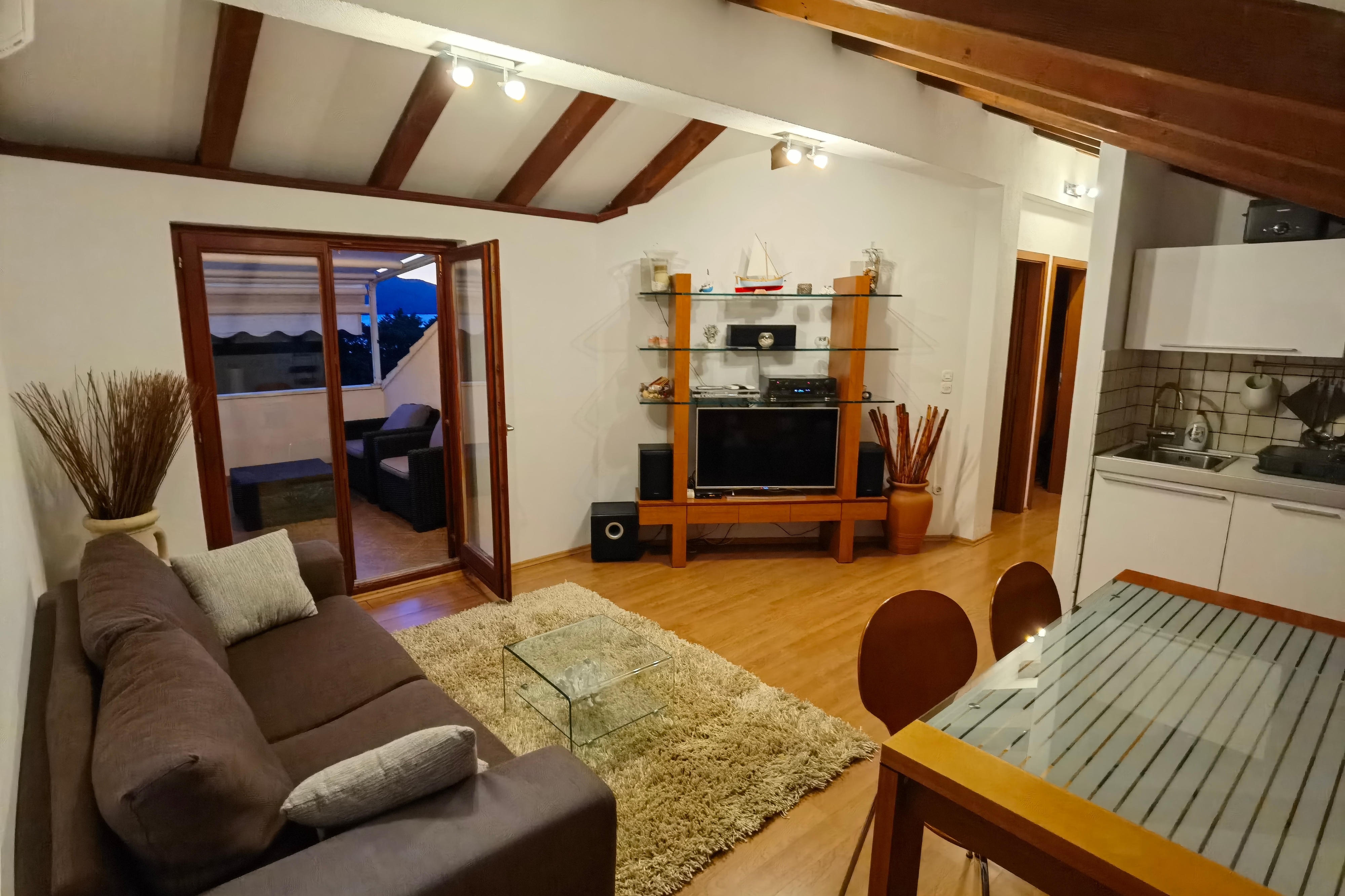 Apartament może przyjąć 4 gości. Łóżka znajdują się w sypialniach, których jest 2, na powierzchni 53m2. Goście mają dostęp do tarasu, by korzystać z ciepłych, letnich wieczorów. Z apartamentu roztacza się widok na morze. W trakcie swojego pobytu goście mogą korzystać ze wspólnego basenu. WLICZONE W CENĘ: taksa pobytowa, sprzątanie końcowe, klimatyzacja, basen, parking, internet, łóżeczko dziecięce, żelazko, deska do prasowania, suszarka do włosów. OBOWIĄZKOWE KOSZTY DODATKOWE: dopłata za krótki termin (procent dopłaty w zalezności od liczby noclegów: 30% - 1, 20% - 2, 10% - 3). Dostępność dodatkowych usług w rezerwowanym terminie oraz ich cenę (jeśli nie jest podana) należy sprawdzić wcześniej. Za dodatowe usługi, które nie zostały uwzględnione w kalkulacji ceny, płaci się bezpośrednio właścicielowi obiektu, pod warunkiem śe gość korzysta z tych usług.