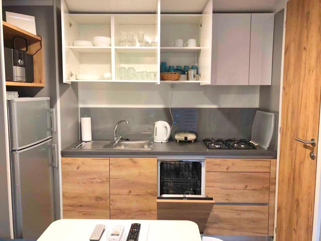 Domek holenderski. Featuring a private entrance, this air-conditioned mobile home consists of 1 living room, 2 separate bedrooms and 2 bathrooms with a shower and a hairdryer. Guests will find a stovetop, a refrigerator, a dishwasher and kitchenware in the kitchen. The mobile home also offers a barbecue. Boasting a terrace with sea views, this mobile home also provides a coffee machine and a flat-screen TV with satellite channels. The unit offers 4 beds. Domek holenderski - 5 osobowy. Powierzchnia pokoju ok.: 32 mkw.