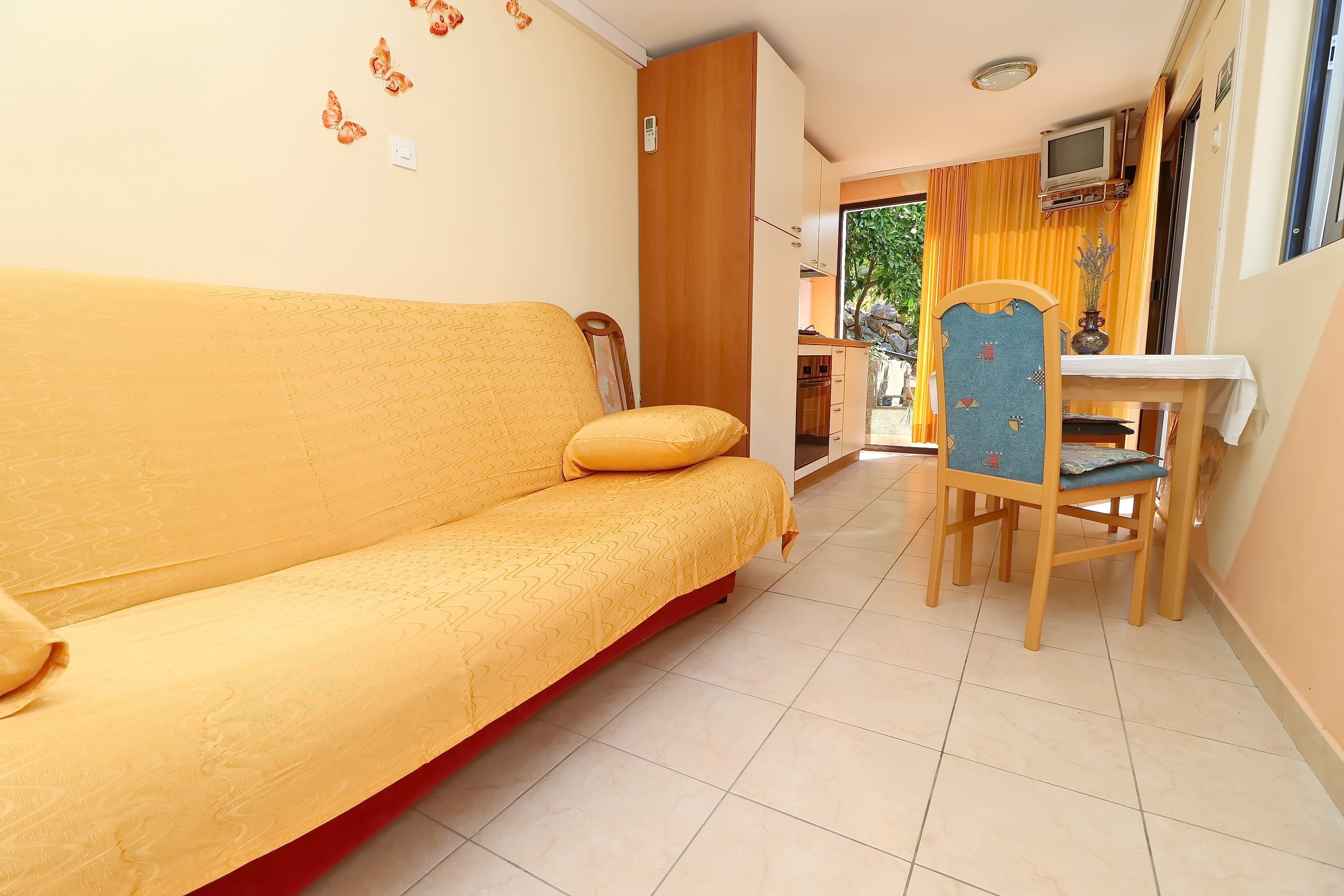 Studio może przyjąć 2 gości. Łóżka znajdują się w sypialniach, których jest 1, na powierzchni 20m2. Goście mają dostęp do balkonu, by korzystać z ciepłych, letnich wieczorów. Z apartamentu typu studio roztacza się widok na morze. Możliwość przygotowywania posiłków poprzez korzystanie ze wspólnego grilla. WLICZONE W CENĘ: taksa pobytowa, sprzątanie końcowe, klimatyzacja, internet, suszarka do włosów. OBOWIĄZKOWE KOSZTY DODATKOWE: dopłata za krótki termin (procent dopłaty w zalezności od liczby noclegów: 30% - 1, 20% - 2, 10% - 3). Dostępność dodatkowych usług w rezerwowanym terminie oraz ich cenę (jeśli nie jest podana) należy sprawdzić wcześniej. Za dodatowe usługi, które nie zostały uwzględnione w kalkulacji ceny, płaci się bezpośrednio właścicielowi obiektu, pod warunkiem śe gość korzysta z tych usług.