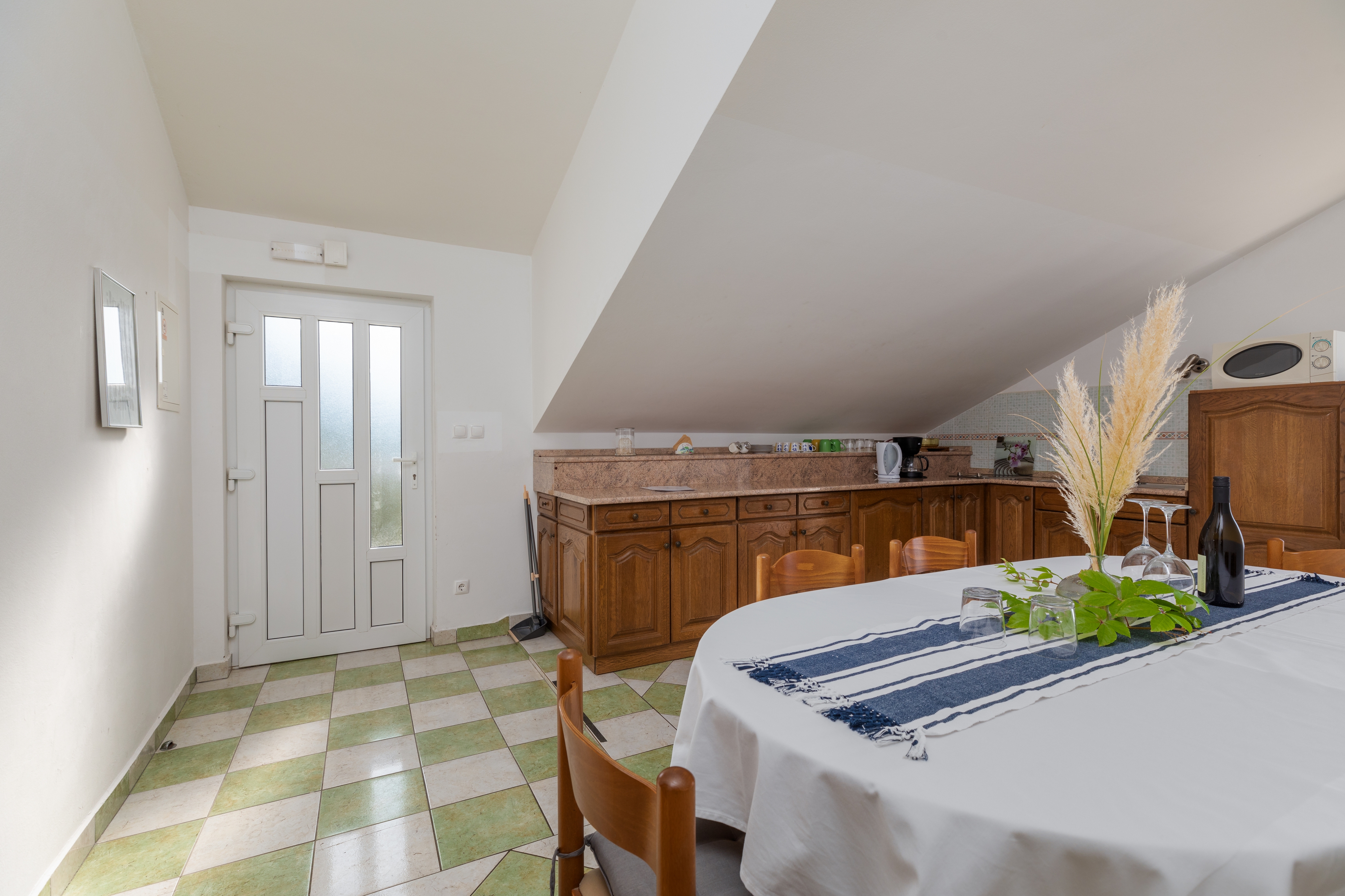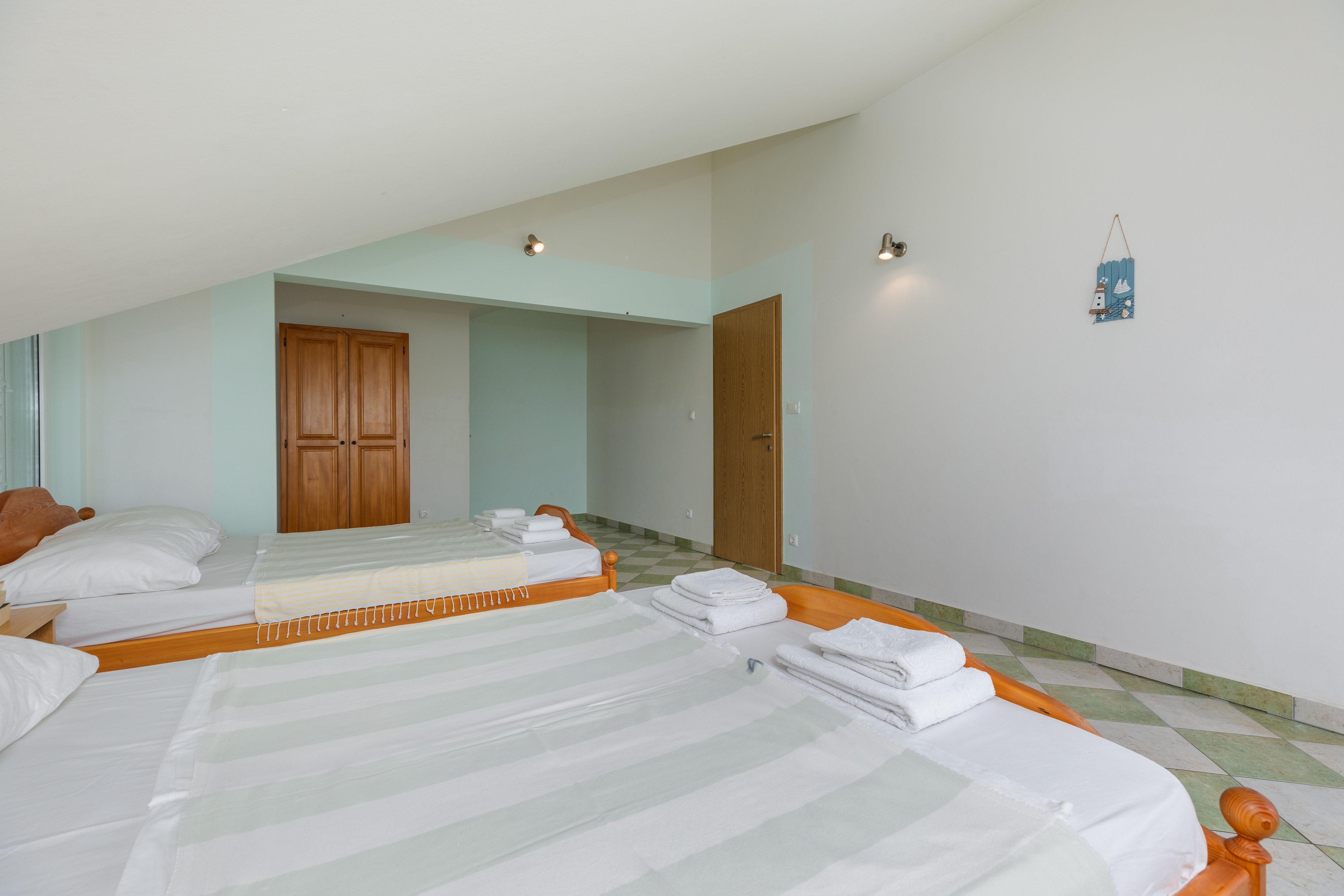 Apartament może przyjąć 8 gości. Łóżka znajdują się w sypialniach, których jest 2, na powierzchni 69m2. Goście mają dostęp do tarasu, by korzystać z ciepłych, letnich wieczorów. Z apartamentu roztacza się widok na morze. Możliwość przygotowywania posiłków poprzez korzystanie ze wspólnego grilla. W trakcie swojego pobytu goście mogą korzystać ze wspólnego basenu. WLICZONE W CENĘ: taksa pobytowa, sprzątanie końcowe, klimatyzacja, basen, parking, internet, żelazko, suszarka do włosów. OBOWIĄZKOWE KOSZTY DODATKOWE: dopłata za krótki termin (procent dopłaty w zalezności od liczby noclegów: 30% - 1, 20% - 2, 10% - 3). NIEOBOWIĄZKOWE KOSZTY DODATKOWE: pranie bielizny (5,00 € pranie). Dostępność dodatkowych usług w rezerwowanym terminie oraz ich cenę (jeśli nie jest podana) należy sprawdzić wcześniej. Za dodatowe usługi, które nie zostały uwzględnione w kalkulacji ceny, płaci się bezpośrednio właścicielowi obiektu, pod warunkiem śe gość korzysta z tych usług. Zniżki od ceny podstawowej: bezpłatny dzień 14=13 (przy pobycie, trwającym co najmniej 14 dni, otrzymujecie jeden bezpłatny dzień na pobyt do 31.12.2026).