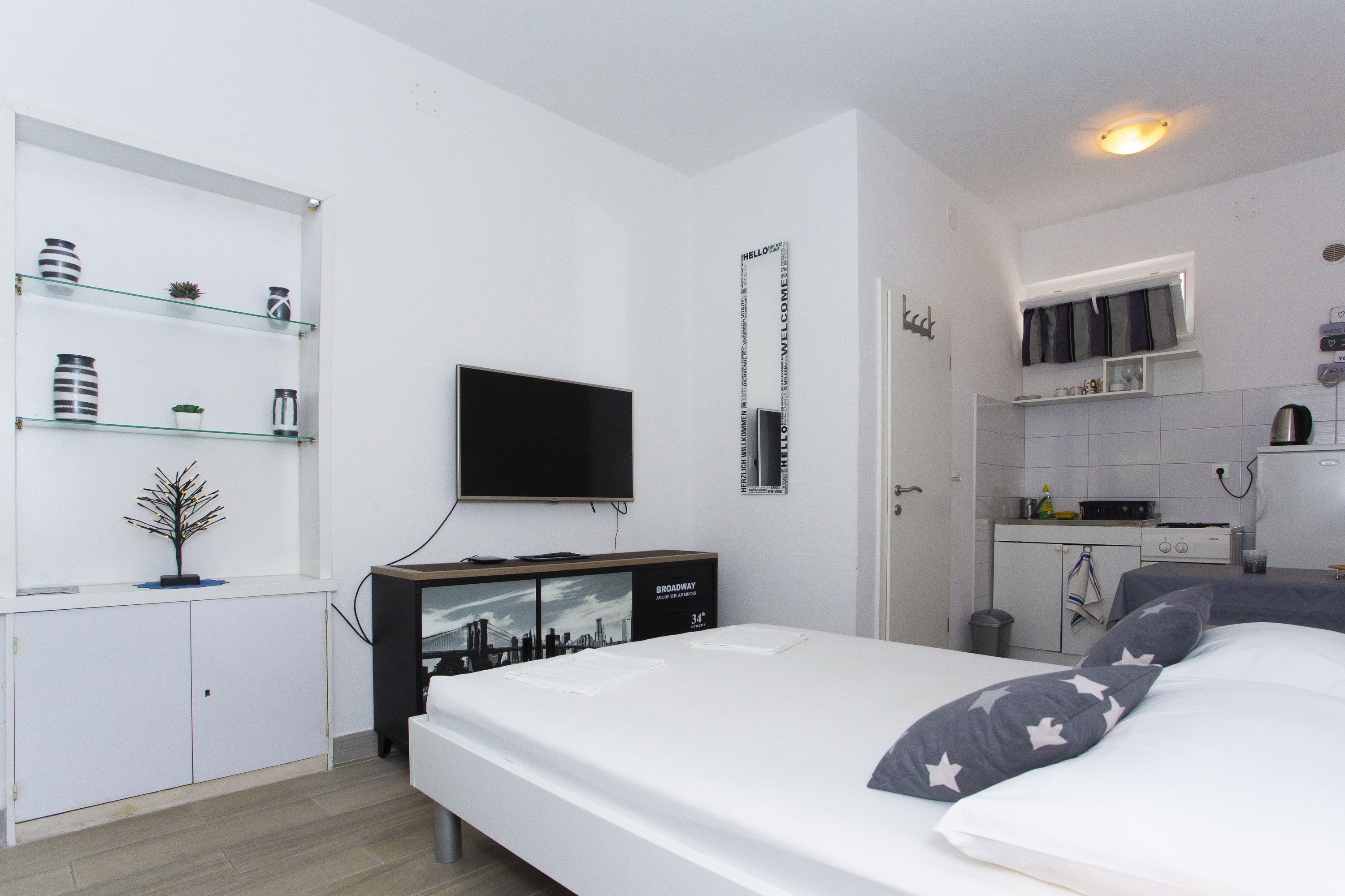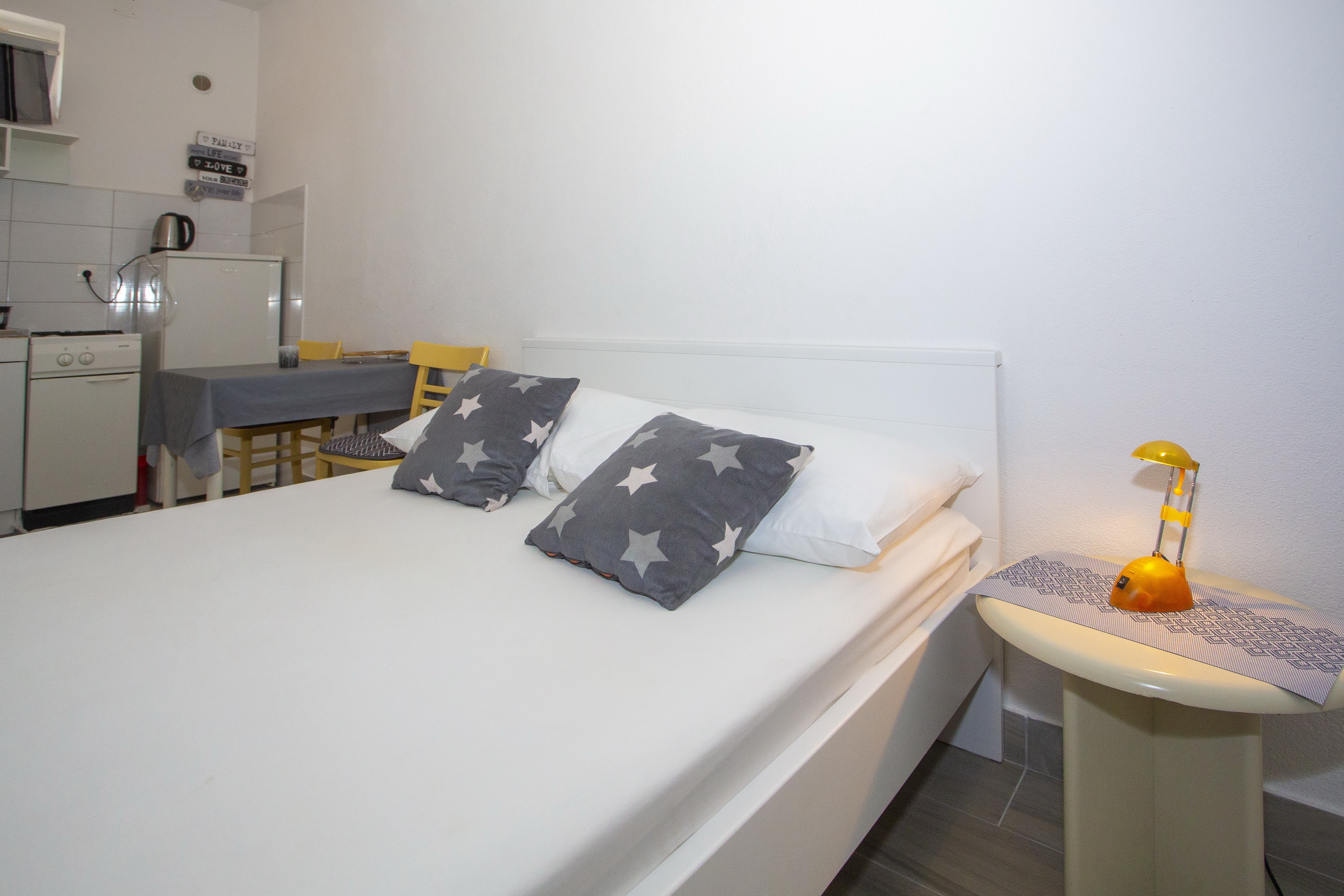 Studio może przyjąć 2 gości. Łóżka znajdują się w sypialniach, których jest 1, na powierzchni 18m2. Goście mają dostęp do tarasu, by korzystać z ciepłych, letnich wieczorów. W kwaterze dozwolony jest pobyt zwierzęcia domowego, za dopłatą. WLICZONE W CENĘ: taksa pobytowa, sprzątanie końcowe, klimatyzacja, parking, internet, żelazko, deska do prasowania, suszarka do włosów. OBOWIĄZKOWE KOSZTY DODATKOWE: dopłata za krótki termin (procent dopłaty w zalezności od liczby noclegów: 30% - 1, 20% - 2, 10% - 3). NIEOBOWIĄZKOWE KOSZTY DODATKOWE: zwierzęta domowe (5,00 € za nocleg). Dostępność dodatkowych usług w rezerwowanym terminie oraz ich cenę (jeśli nie jest podana) należy sprawdzić wcześniej. Za dodatowe usługi, które nie zostały uwzględnione w kalkulacji ceny, płaci się bezpośrednio właścicielowi obiektu, pod warunkiem śe gość korzysta z tych usług. Zniżki od ceny podstawowej: bezpłatny dzień 14=13 (przy pobycie, trwającym co najmniej 14 dni, otrzymujecie jeden bezpłatny dzień na pobyt do 31.12.2026).