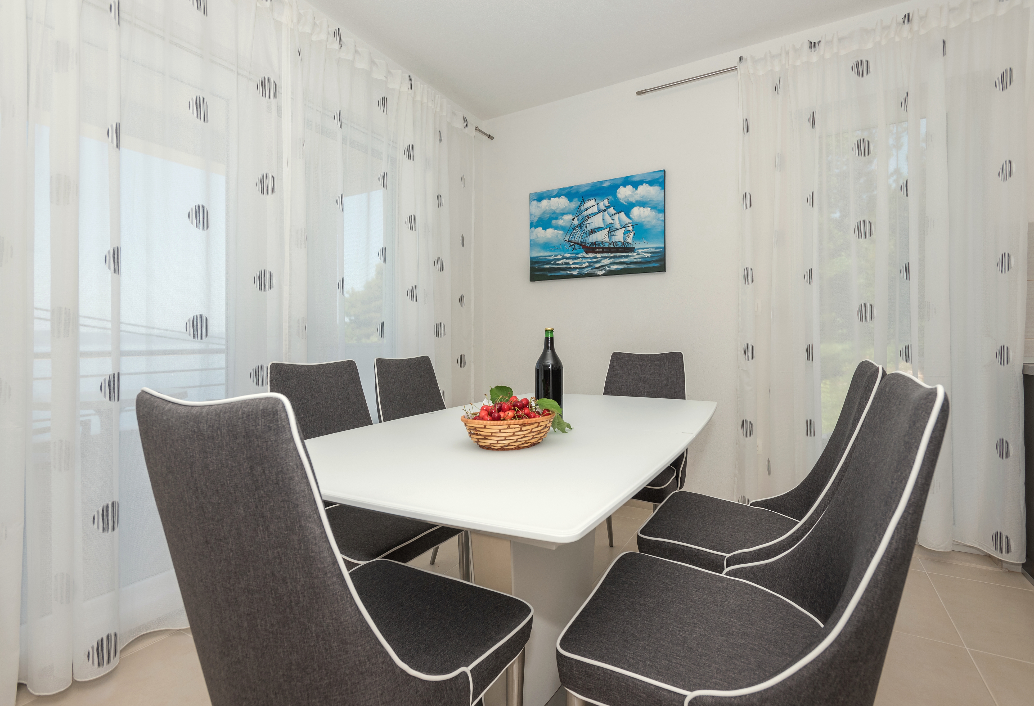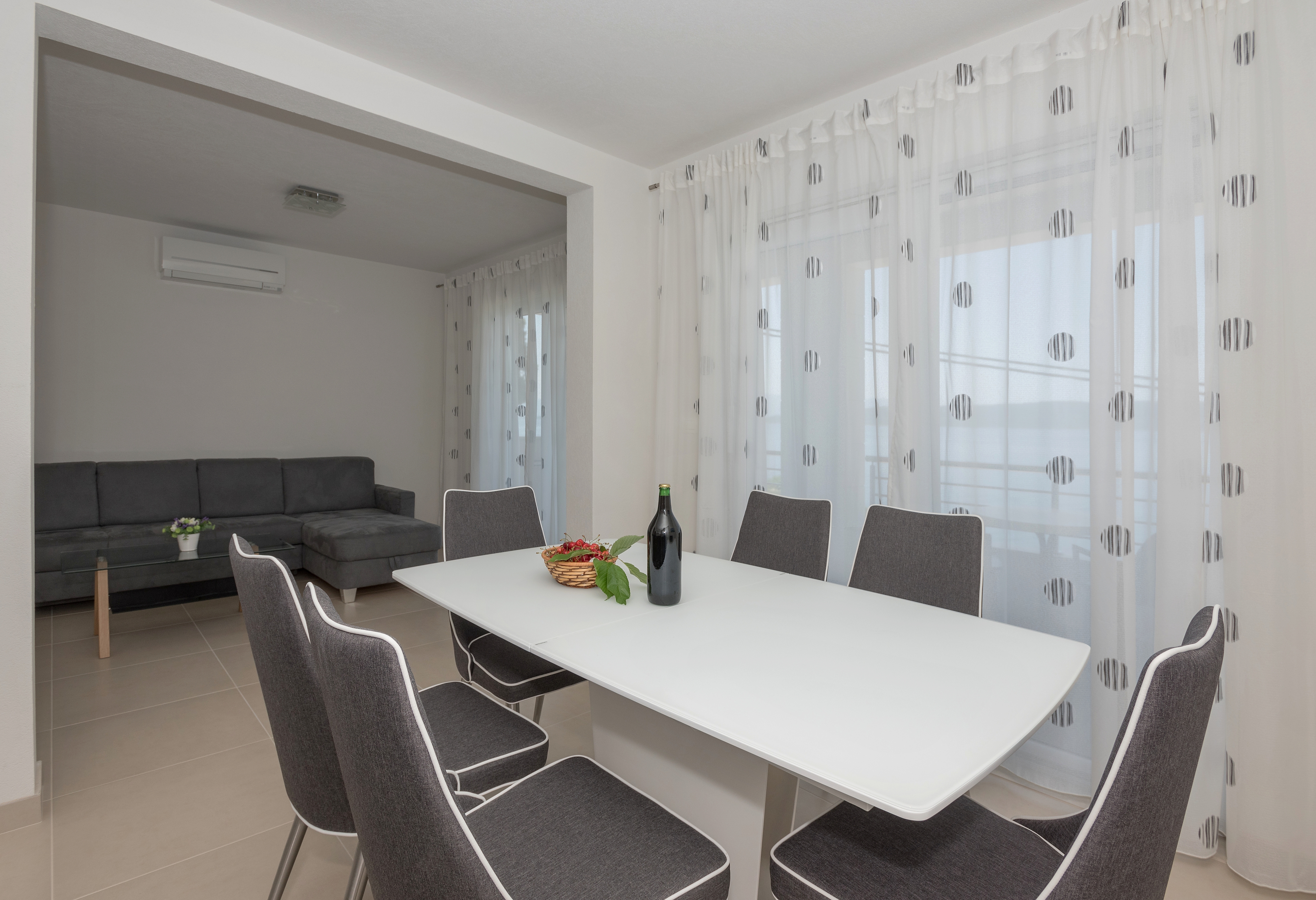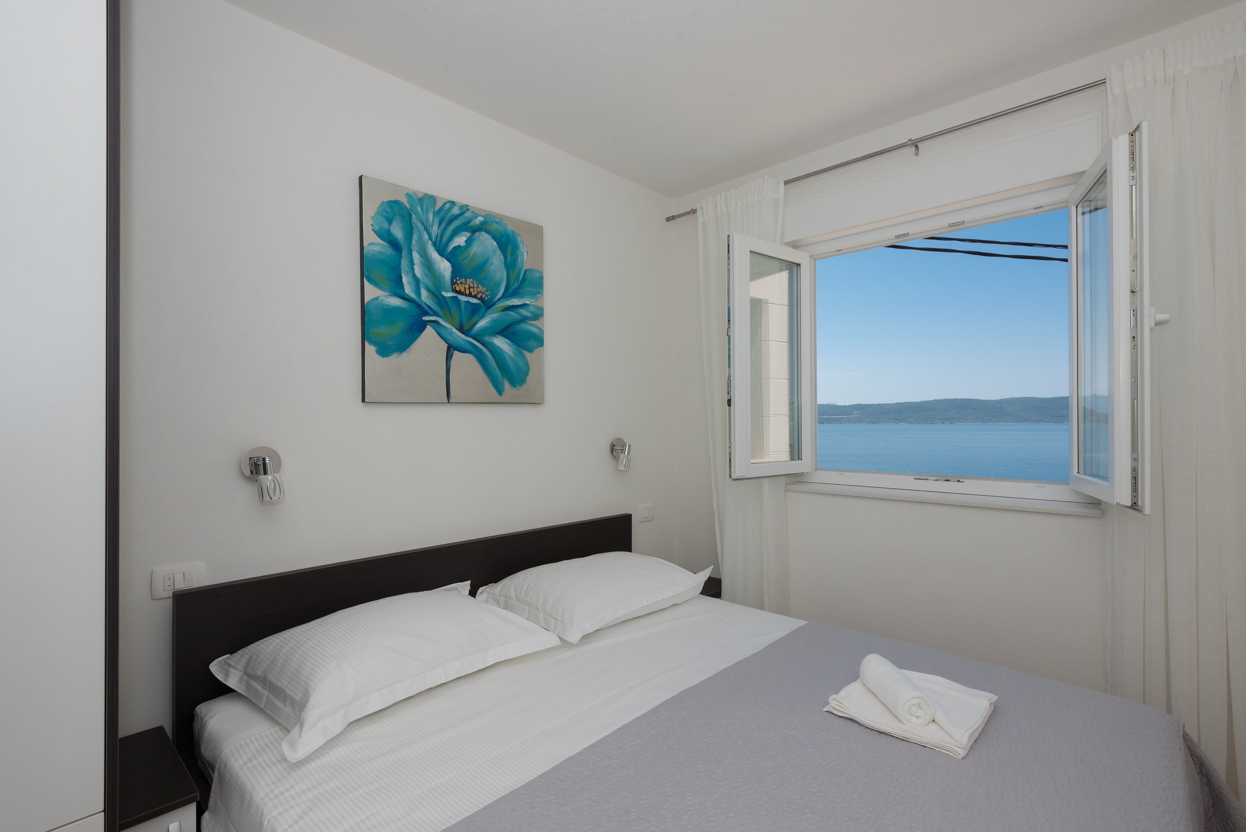 Apartament może przyjąć 5 gości. Łóżka znajdują się w sypialniach, których jest 3, na powierzchni 90m2. Goście mają dostęp do balkonu, by korzystać z ciepłych, letnich wieczorów. Z apartamentu roztacza się widok na morze. Możliwość przygotowywania posiłków poprzez korzystanie ze wspólnego grilla. WLICZONE W CENĘ: taksa pobytowa, sprzątanie końcowe, klimatyzacja, parking, internet, żelazko, deska do prasowania, suszarka do włosów. Dostępność dodatkowych usług w rezerwowanym terminie oraz ich cenę (jeśli nie jest podana) należy sprawdzić wcześniej. Za dodatowe usługi, które nie zostały uwzględnione w kalkulacji ceny, płaci się bezpośrednio właścicielowi obiektu, pod warunkiem śe gość korzysta z tych usług.