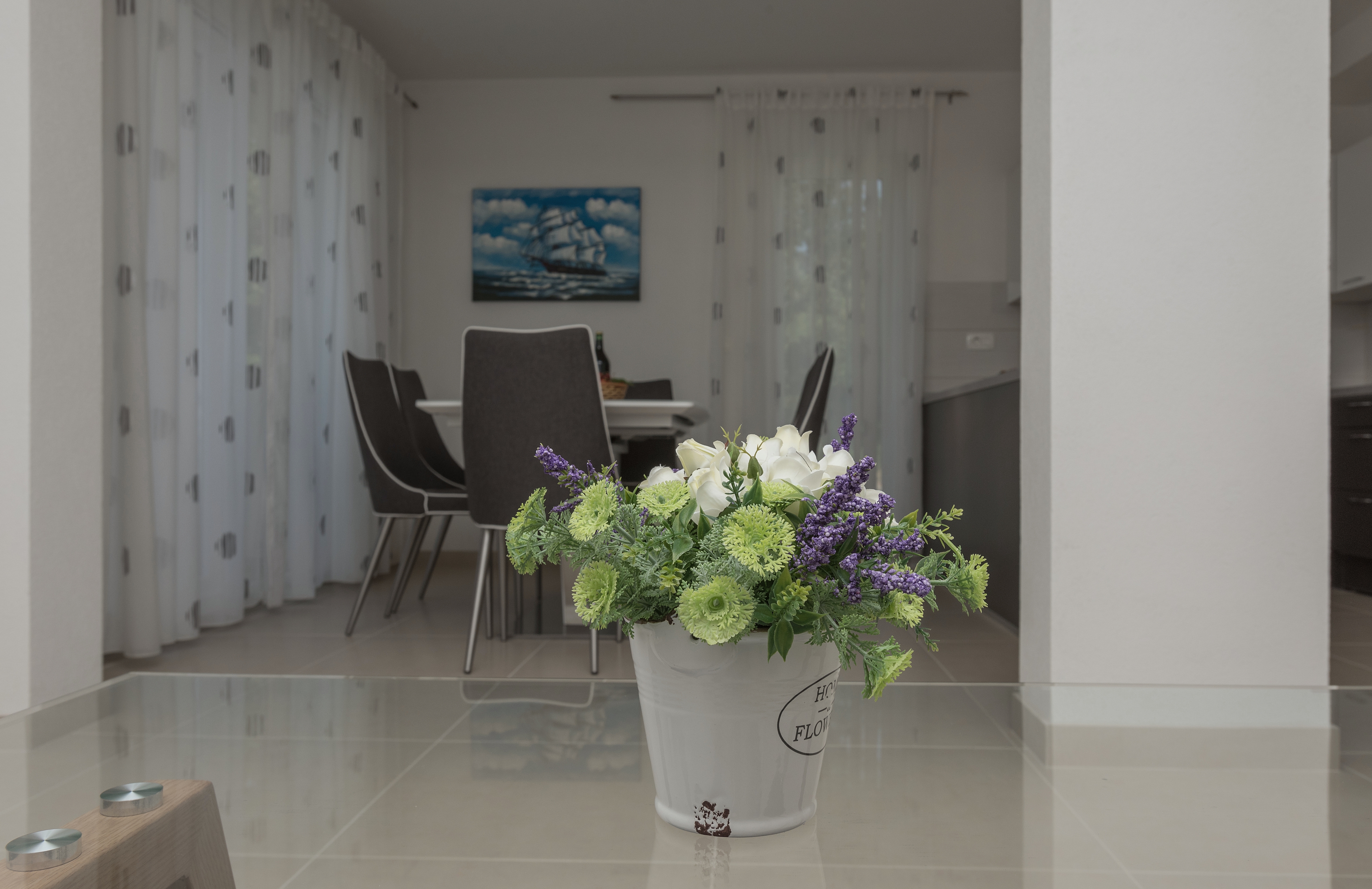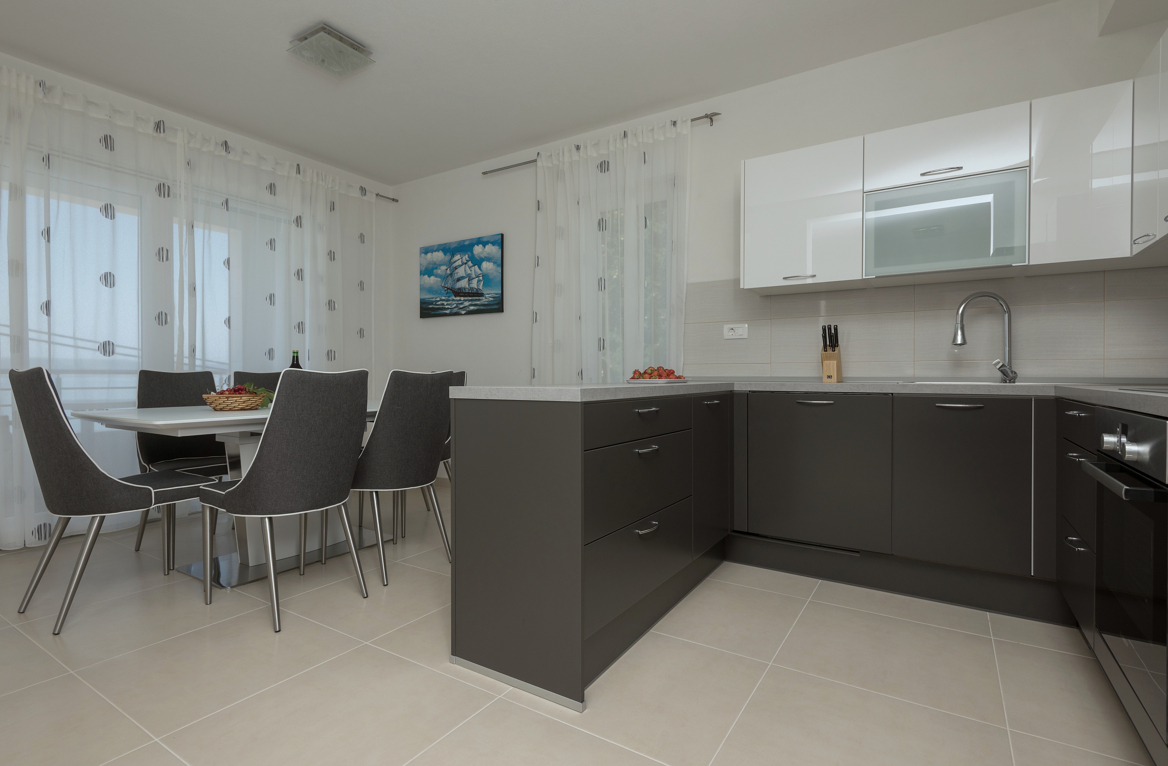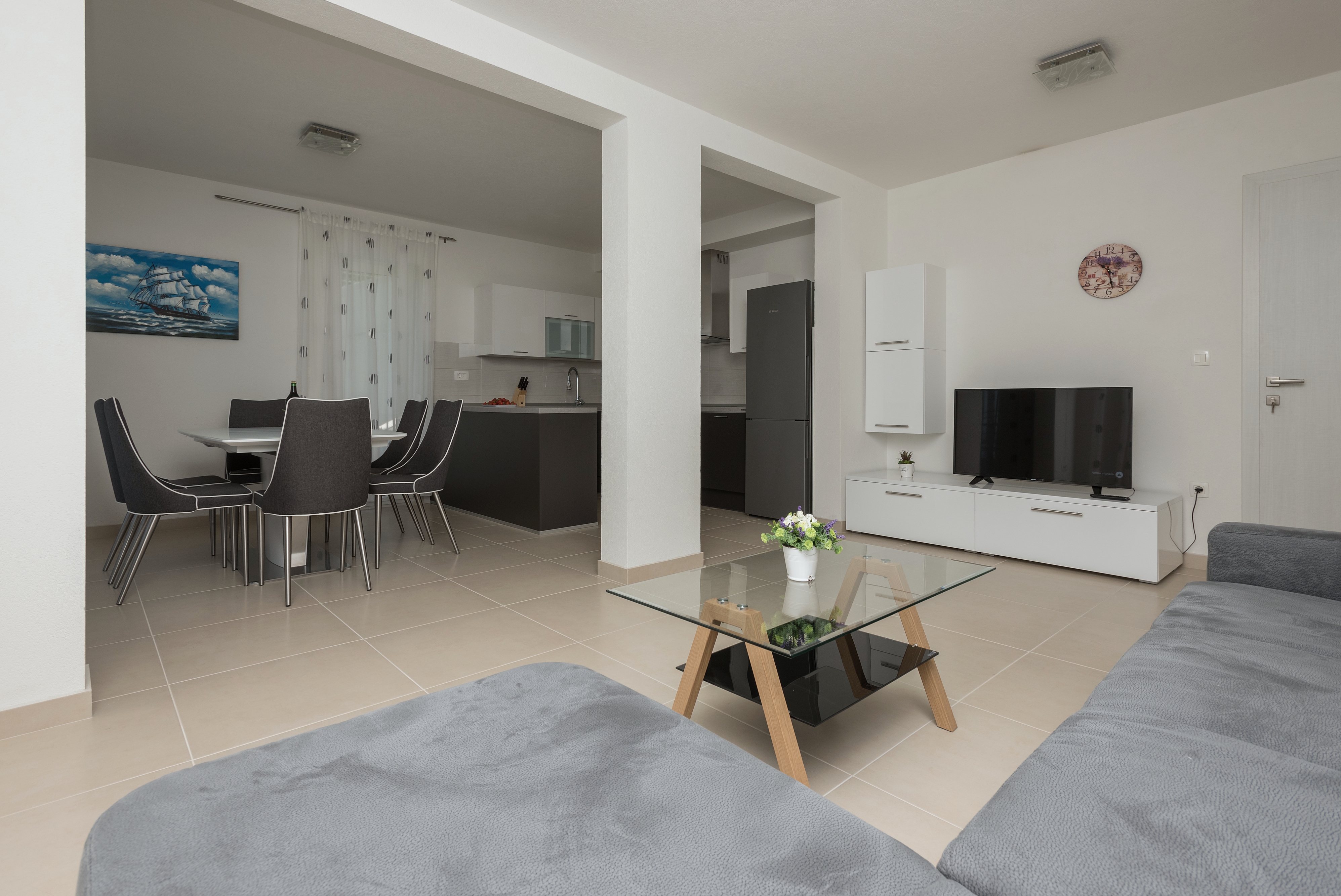 Apartament może przyjąć 5 gości. Łóżka znajdują się w sypialniach, których jest 3, na powierzchni 90m2. Goście mają dostęp do balkonu, by korzystać z ciepłych, letnich wieczorów. Z apartamentu roztacza się widok na morze. Możliwość przygotowywania posiłków poprzez korzystanie ze wspólnego grilla. WLICZONE W CENĘ: taksa pobytowa, sprzątanie końcowe, klimatyzacja, parking, internet, żelazko, deska do prasowania, suszarka do włosów. Dostępność dodatkowych usług w rezerwowanym terminie oraz ich cenę (jeśli nie jest podana) należy sprawdzić wcześniej. Za dodatowe usługi, które nie zostały uwzględnione w kalkulacji ceny, płaci się bezpośrednio właścicielowi obiektu, pod warunkiem śe gość korzysta z tych usług.