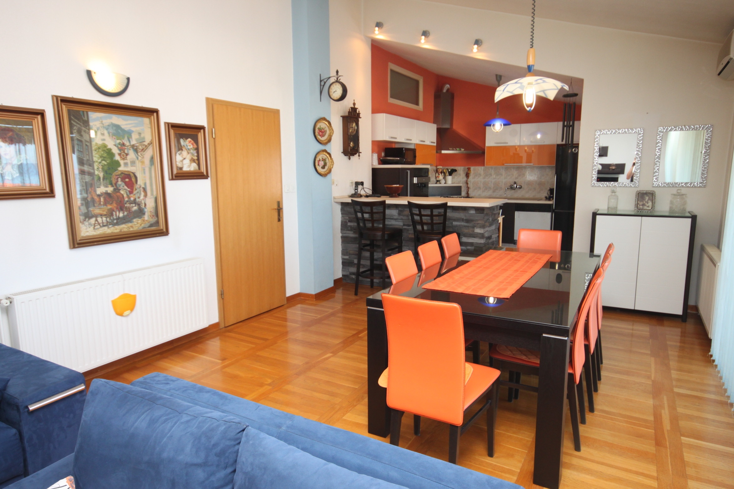 Apartament może przyjąć 6 gości. Łóżka znajdują się w sypialniach, których jest 2, oraz w pokoju dziennym, na powierzchni 94m2. Goście mają dostęp do balkonu, by korzystać z ciepłych, letnich wieczorów. Z apartamentu roztacza się widok na morze. Do kwatery można przyjechać ze zwierzęciem domowym, a usługa jest wliczona w cenę wynajęcia kwatery. WLICZONE W CENĘ: taksa pobytowa, sprzątanie końcowe, klimatyzacja, parking, internet, zwierzęta domowe, łóżeczko dziecięce, żelazko, suszarka do włosów. Dostępność dodatkowych usług w rezerwowanym terminie oraz ich cenę (jeśli nie jest podana) należy sprawdzić wcześniej. Za dodatowe usługi, które nie zostały uwzględnione w kalkulacji ceny, płaci się bezpośrednio właścicielowi obiektu, pod warunkiem śe gość korzysta z tych usług.
