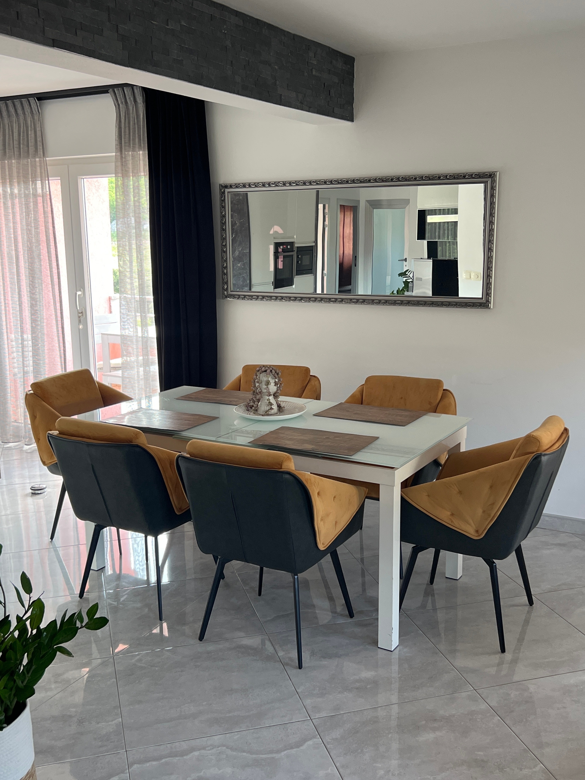 Apartament może przyjąć 6 gości. Łóżka znajdują się w sypialniach, których jest 3, na powierzchni 113m2. Goście mają dostęp do tarasu, by korzystać z ciepłych, letnich wieczorów. Z apartamentu roztacza się widok na morze. Możliwość przygotowywania posiłków poprzez korzystanie ze wspólnego grilla. W trakcie swojego pobytu goście mogą korzystać ze wspólnego basenu. W rezerwowanej kwaterze na miejscu jest pobierana kaucja (jej wysokość jest podana na stronie). WLICZONE W CENĘ: taksa pobytowa, sprzątanie końcowe, klimatyzacja, centralne ogrzewanie, basen, parking, internet, suszarka do włosów. OBOWIĄZKOWE KOSZTY DODATKOWE: depozyt (300,00 € jednorazowo). NIEOBOWIĄZKOWE KOSZTY DODATKOWE: miejsce do cumowania łodzi (15,00 € za nocleg), dostawka (7,00 € za nocleg). Dostępność dodatkowych usług w rezerwowanym terminie oraz ich cenę (jeśli nie jest podana) należy sprawdzić wcześniej. Za dodatowe usługi, które nie zostały uwzględnione w kalkulacji ceny, płaci się bezpośrednio właścicielowi obiektu, pod warunkiem śe gość korzysta z tych usług.