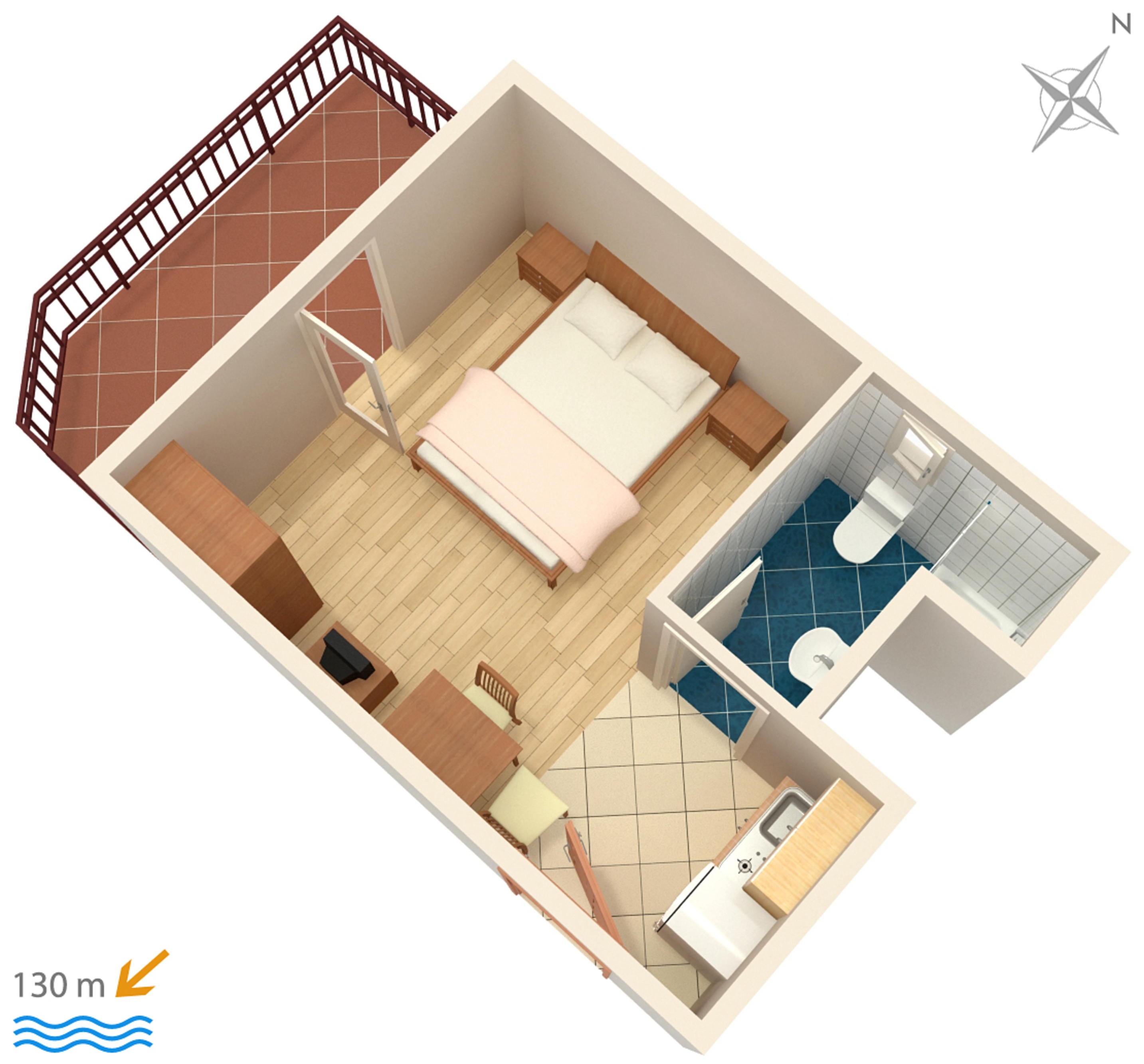 Studio może przyjąć 2 gości. Łóżka znajdują się w sypialniach, których jest 1, na powierzchni 20m2. Goście mają dostęp do tarasu, by korzystać z ciepłych, letnich wieczorów. Możliwość przygotowywania posiłków poprzez korzystanie ze wspólnego grilla. WLICZONE W CENĘ: taksa pobytowa, sprzątanie końcowe, klimatyzacja, parking, internet. OBOWIĄZKOWE KOSZTY DODATKOWE: dopłata za krótki termin (procent dopłaty w zalezności od liczby noclegów: 30% - 1, 20% - 2, 10% - 3). Dostępność dodatkowych usług w rezerwowanym terminie oraz ich cenę (jeśli nie jest podana) należy sprawdzić wcześniej. Za dodatowe usługi, które nie zostały uwzględnione w kalkulacji ceny, płaci się bezpośrednio właścicielowi obiektu, pod warunkiem śe gość korzysta z tych usług.
