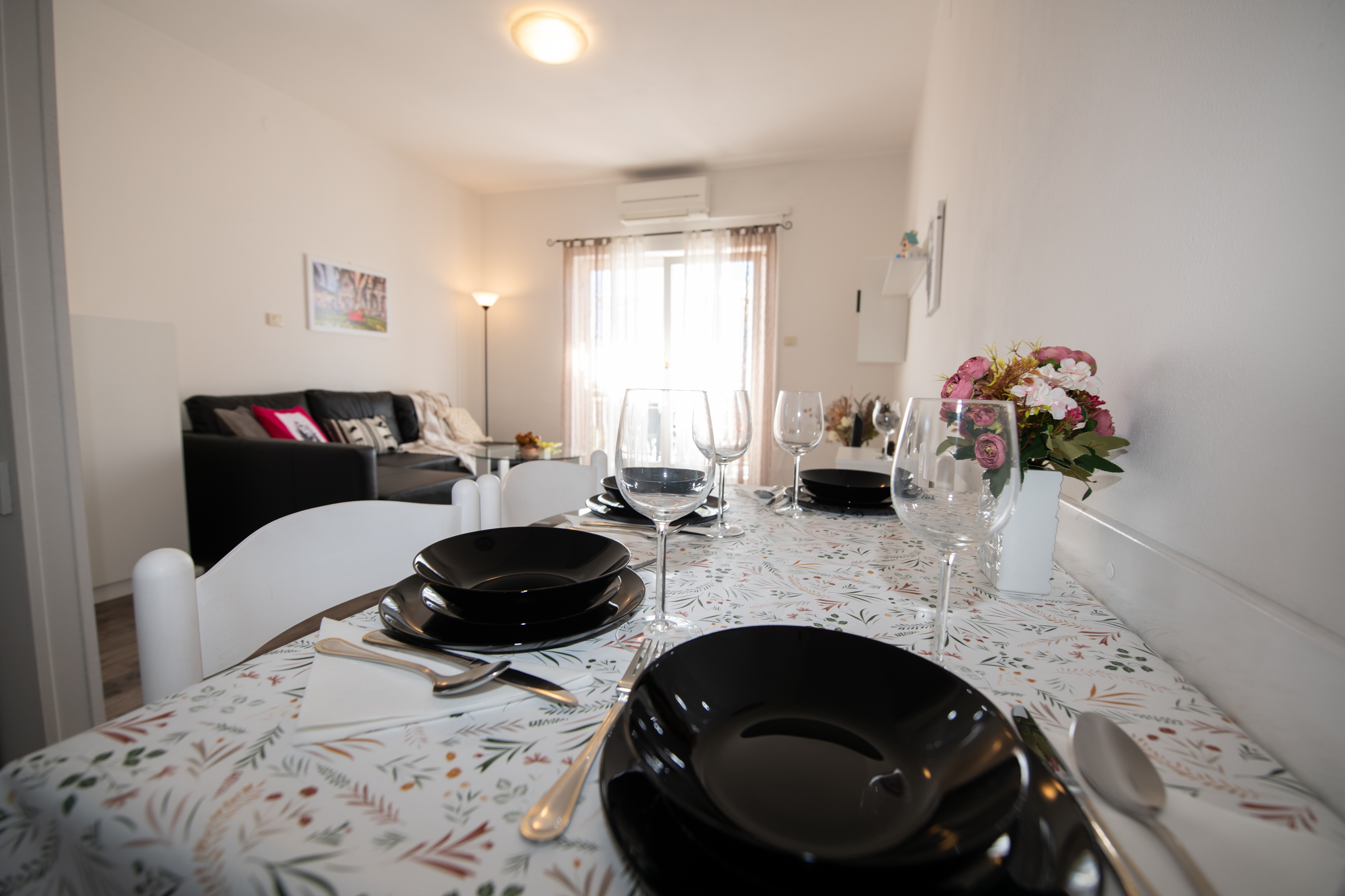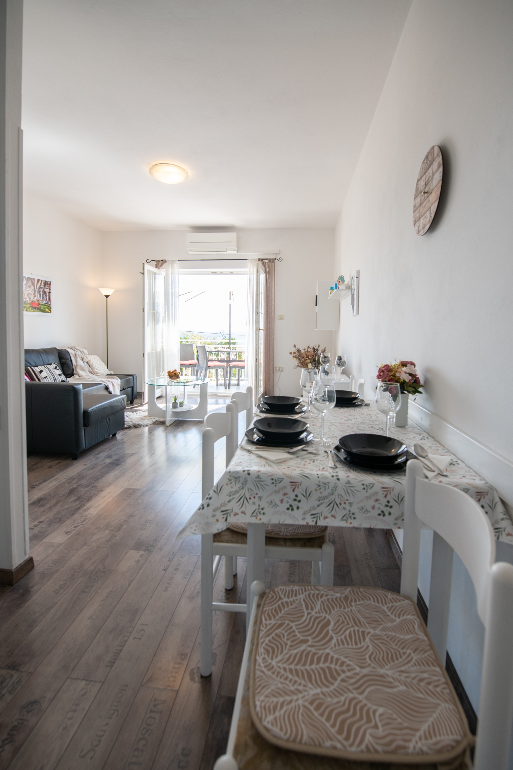 Apartament może przyjąć 4 gości. Łóżka znajdują się w sypialniach, których jest 1, oraz w pokoju dziennym, na powierzchni 47m2. Goście mają dostęp do tarasu, by korzystać z ciepłych, letnich wieczorów. Z apartamentu roztacza się widok na morze. W kwaterze dozwolony jest pobyt zwierzęcia domowego, za dopłatą. WLICZONE W CENĘ: taksa pobytowa, sprzątanie końcowe, klimatyzacja, parking, internet, łóżeczko dziecięce, żelazko, deska do prasowania, suszarka do włosów. NIEOBOWIĄZKOWE KOSZTY DODATKOWE: zwierzęta domowe (7,00 € za nocleg). Dostępność dodatkowych usług w rezerwowanym terminie oraz ich cenę (jeśli nie jest podana) należy sprawdzić wcześniej. Za dodatowe usługi, które nie zostały uwzględnione w kalkulacji ceny, płaci się bezpośrednio właścicielowi obiektu, pod warunkiem śe gość korzysta z tych usług. Zniżki od ceny podstawowej: bezpłatny dzień 14=13 (przy pobycie, trwającym co najmniej 14 dni, otrzymujecie jeden bezpłatny dzień na pobyt do 31.12.2026).