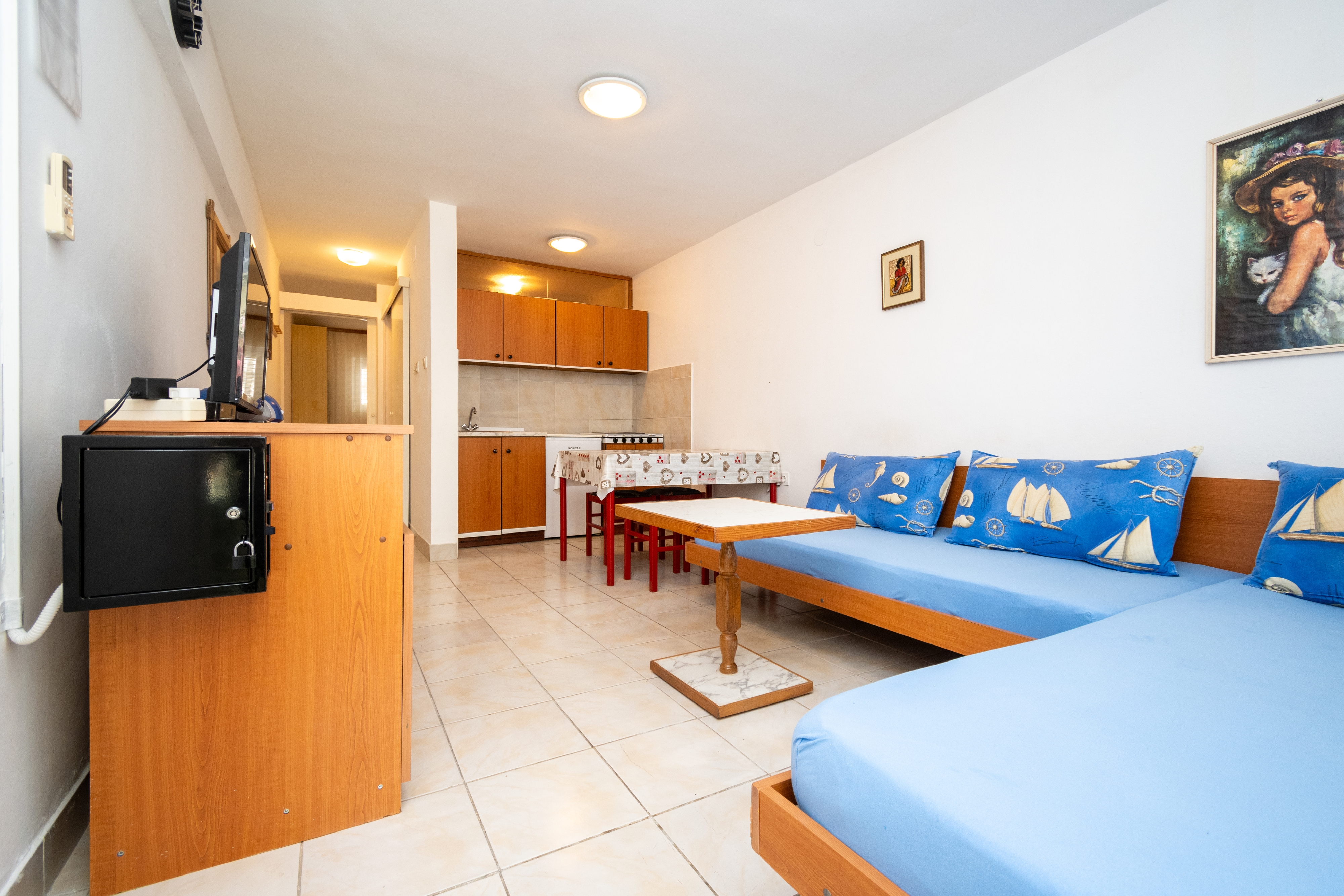 Apartament może przyjąć 4 gości. Łóżka znajdują się w sypialniach, których jest 1, oraz w pokoju dziennym, na powierzchni 28m2. Goście mają dostęp do tarasu, by korzystać z ciepłych, letnich wieczorów. Możliwość przygotowywania posiłków poprzez korzystanie ze wspólnego grilla. WLICZONE W CENĘ: taksa pobytowa, sprzątanie końcowe, parking, internet, pranie bielizny. OBOWIĄZKOWE KOSZTY DODATKOWE: dopłata za krótki termin (procent dopłaty w zalezności od liczby noclegów: 30% - 1, 20% - 2, 10% - 3). NIEOBOWIĄZKOWE KOSZTY DODATKOWE: klimatyzacja (0,50 € za godzinę), dostawka (10,00 € za nocleg). Dostępność dodatkowych usług w rezerwowanym terminie oraz ich cenę (jeśli nie jest podana) należy sprawdzić wcześniej. Za dodatowe usługi, które nie zostały uwzględnione w kalkulacji ceny, płaci się bezpośrednio właścicielowi obiektu, pod warunkiem śe gość korzysta z tych usług.