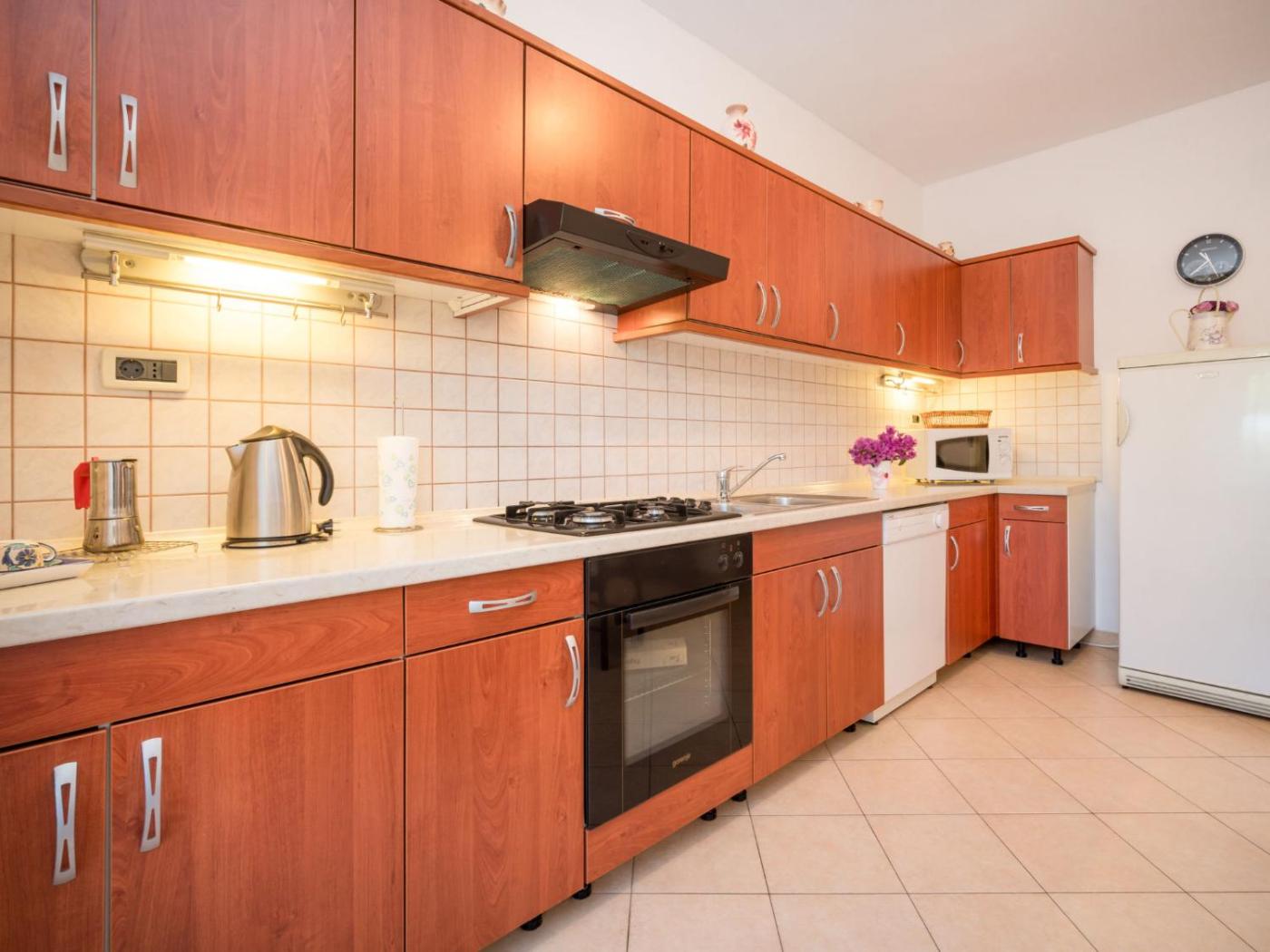 W apartamencie do dyspozycji gości przygotowano kilka sypialni (2), kuchnię ze standardowym wyposażeniem, takim jak lodówka i zmywarka, a także łazienkę (1) z bidetem. Wyposażenie obejmuje także pralkę oraz telewizor.