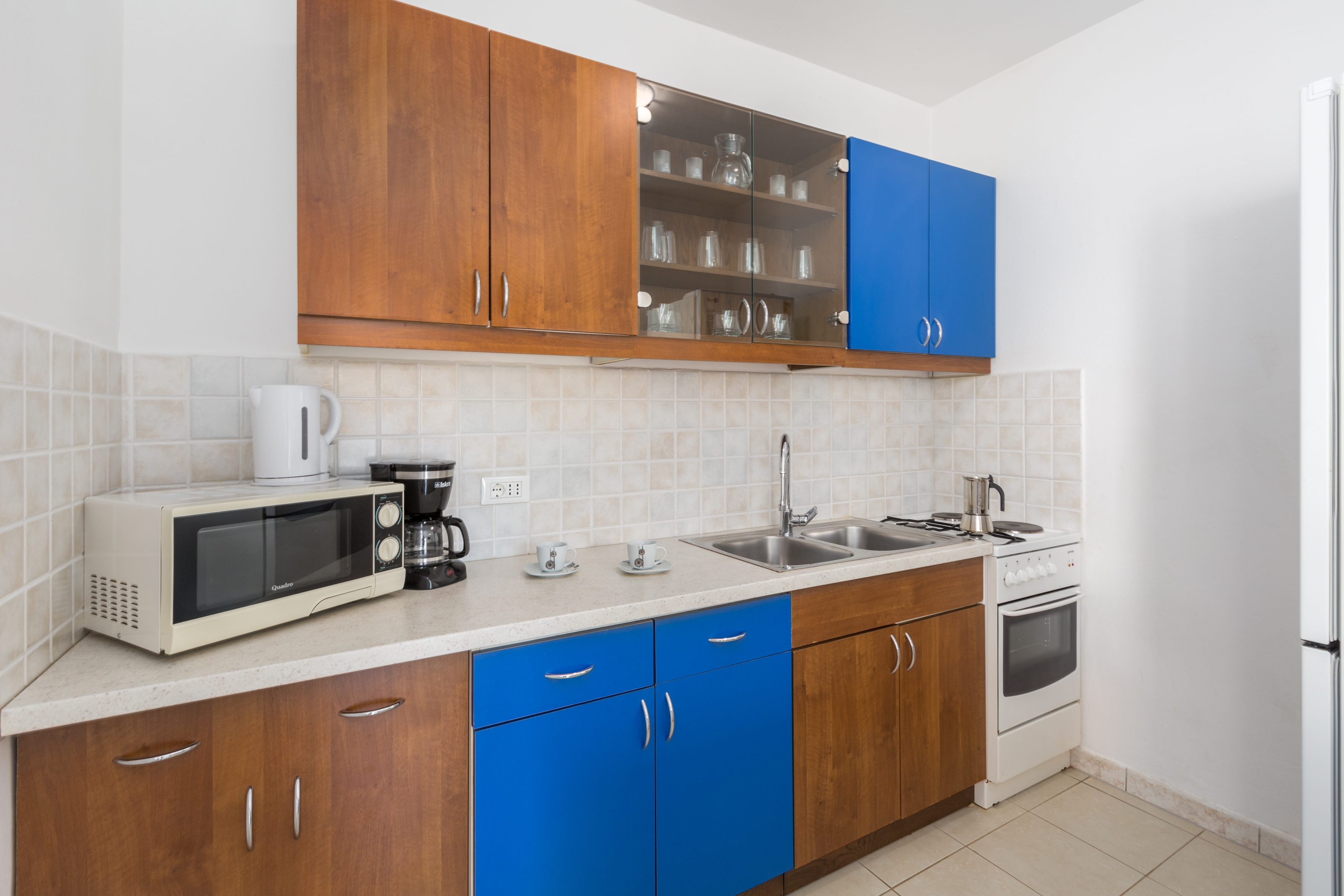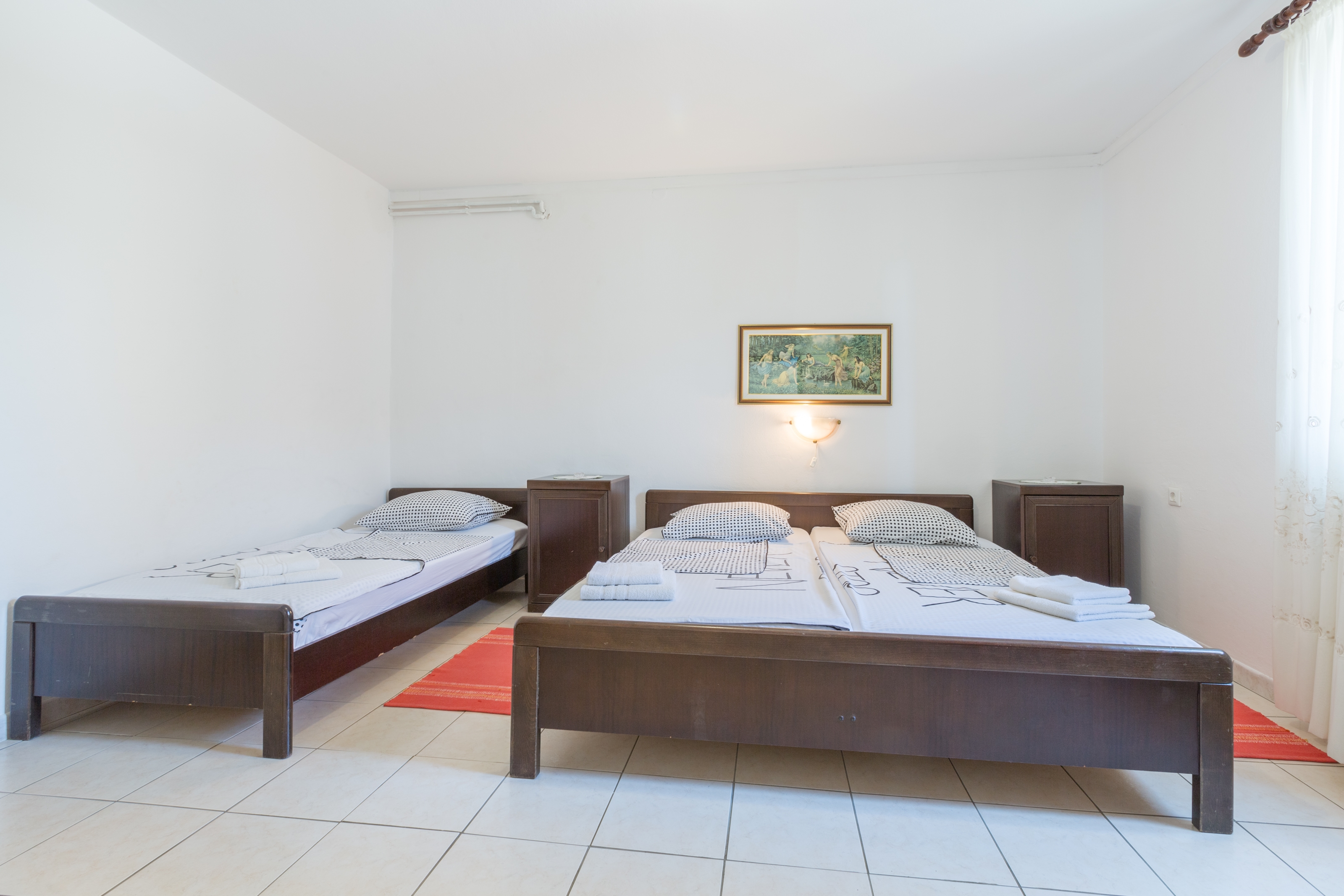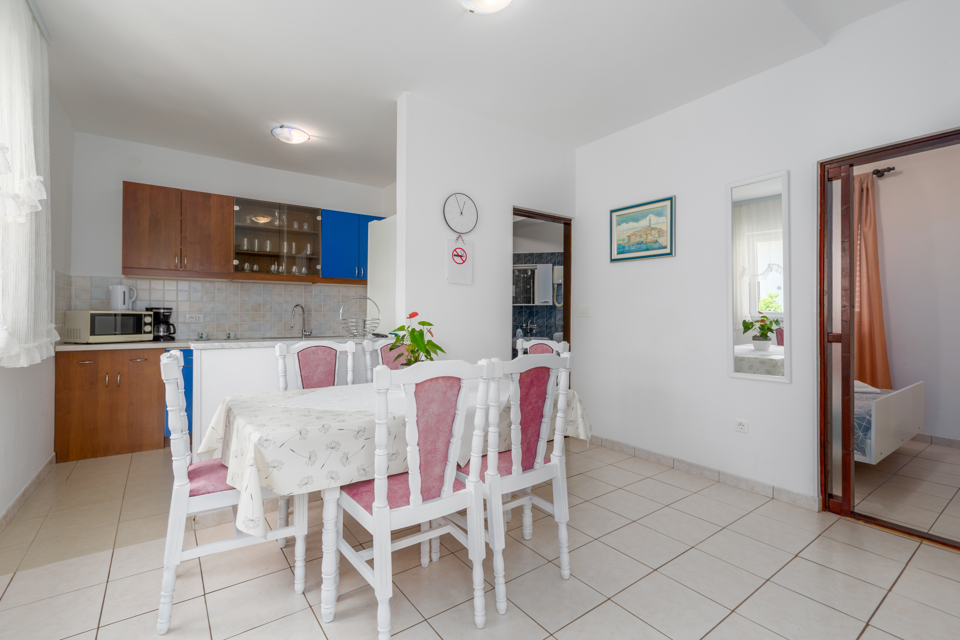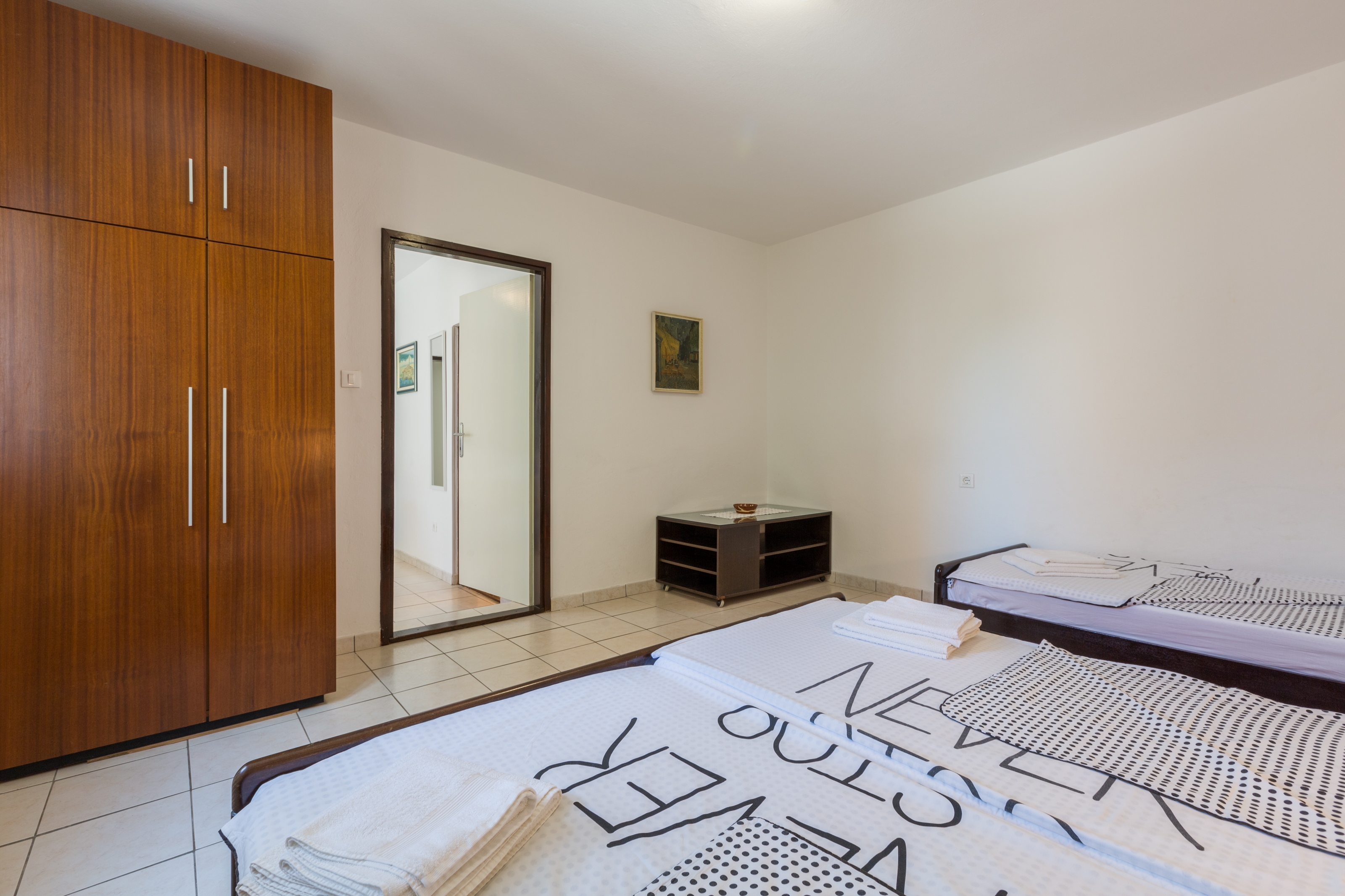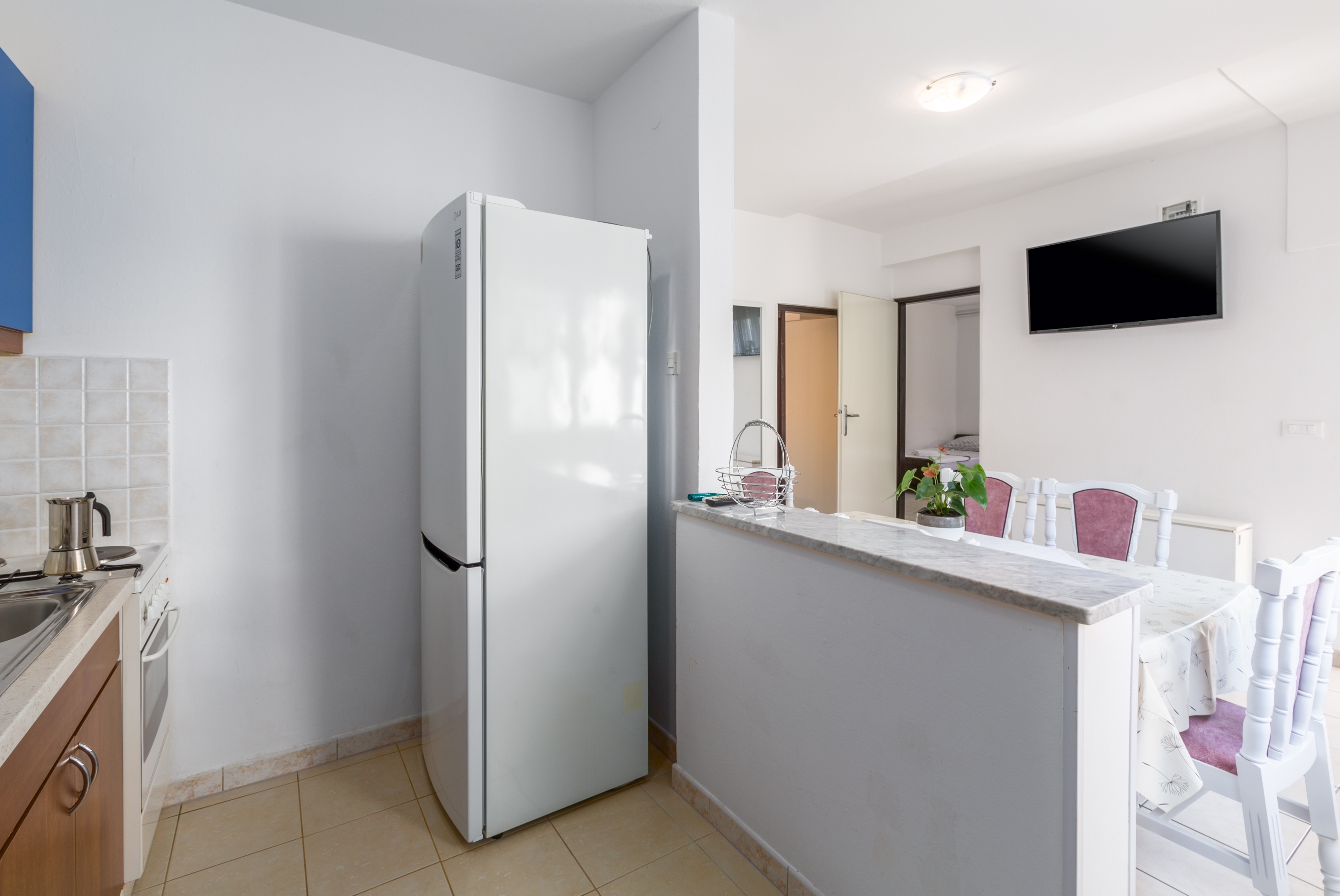 Apartament może przyjąć 5 gości. Łóżka znajdują się w sypialniach, których jest 2, na powierzchni 45m2. Goście mają dostęp do tarasu, by korzystać z ciepłych, letnich wieczorów. Możliwość przygotowywania posiłków poprzez korzystanie ze wspólnego grilla. W kwaterze dozwolony jest pobyt zwierzęcia domowego, za dopłatą. WLICZONE W CENĘ: taksa pobytowa, sprzątanie końcowe, klimatyzacja, parking, internet, łóżeczko dziecięce, żelazko, deska do prasowania, suszarka do włosów. OBOWIĄZKOWE KOSZTY DODATKOWE: dopłata za krótki termin (procent dopłaty w zalezności od liczby noclegów: 30% - 1, 20% - 2, 10% - 3). NIEOBOWIĄZKOWE KOSZTY DODATKOWE: zwierzęta domowe (7,00 € za nocleg). Dostępność dodatkowych usług w rezerwowanym terminie oraz ich cenę (jeśli nie jest podana) należy sprawdzić wcześniej. Za dodatowe usługi, które nie zostały uwzględnione w kalkulacji ceny, płaci się bezpośrednio właścicielowi obiektu, pod warunkiem śe gość korzysta z tych usług. Zniżki od ceny podstawowej: bezpłatny dzień 14=13 (przy pobycie, trwającym co najmniej 14 dni, otrzymujecie jeden bezpłatny dzień na pobyt do 31.12.2026).