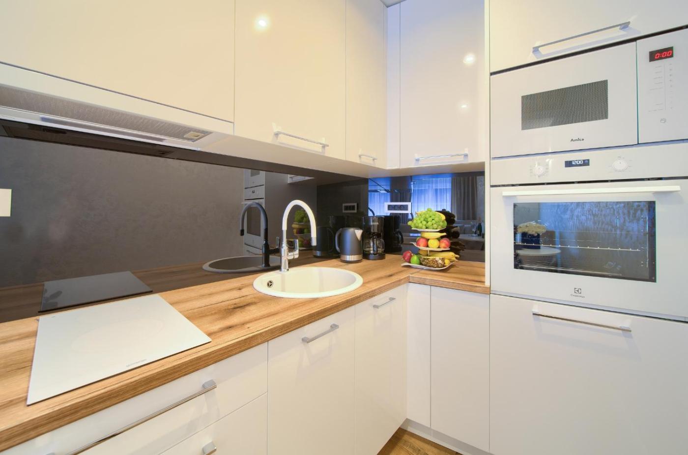 Oferta apartamentu obejmuje sypialnię (1), salon, kuchnię z pełnym wyposażeniem, w tym lodówką i ekspresem do kawy, a także łazienkę (1) z prysznicem oraz suszarką do włosów. W apartamencie zapewniono ręczniki i pościel.