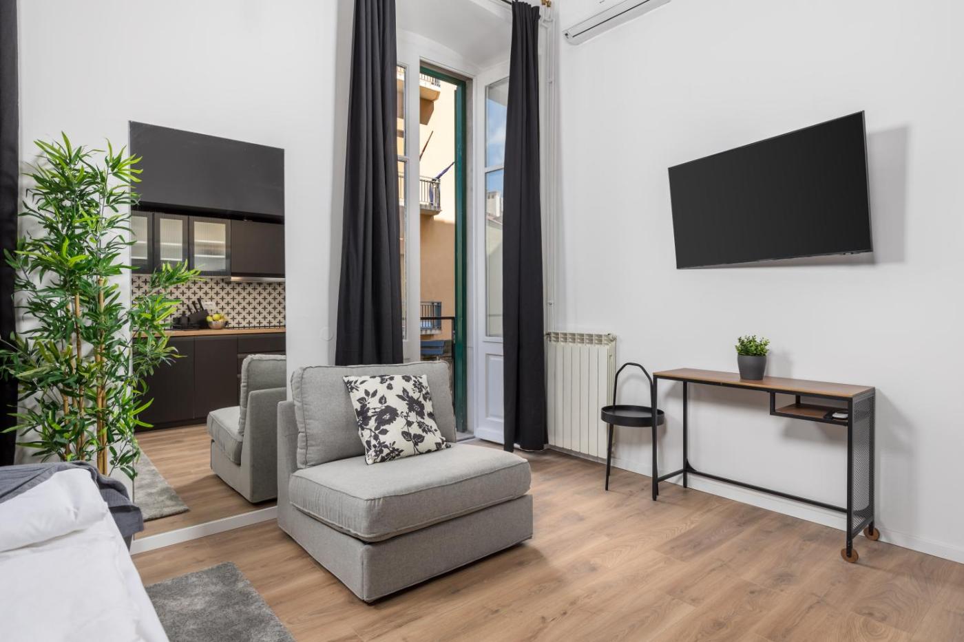 Studio z łóżkiem typu queen-size. The studio features a private bathroom fitted with a shower and a hairdryer. A kitchenette equipped with a stovetop, a refrigerator and kitchenware is available for cooking and storing food. The air-conditioned studio offers a flat-screen TV with satellite channels, a private entrance, a wardrobe, an electric kettle as well as ancourtyard view. The unit offers 1 bed. Studio - 2 osobowy. Powierzchnia pokoju ok.: 22 mkw. ;