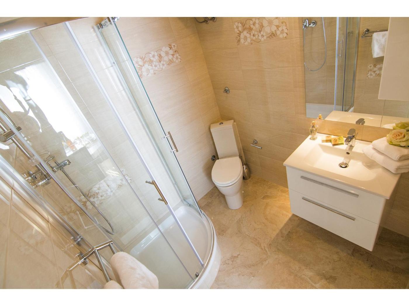 Apartament typu Luxury z 2 sypialniami i widokiem na morze. This spacious apartment features 1 living room, 2 separate bedrooms and 1 bathroom with a walk-in shower and free toiletries. Meals can be prepared in the well-fitted kitchenette, which features a stovetop, a refrigerator, kitchenware and a microwave. The air-conditioned apartment features a flat-screen TV with cable channels, a private entrance, soundproof walls, a tea and coffee maker as well as sea views. The unit has 3 beds. Apartament - 5 osobowy. Powierzchnia pokoju ok.: 80 mkw. ;