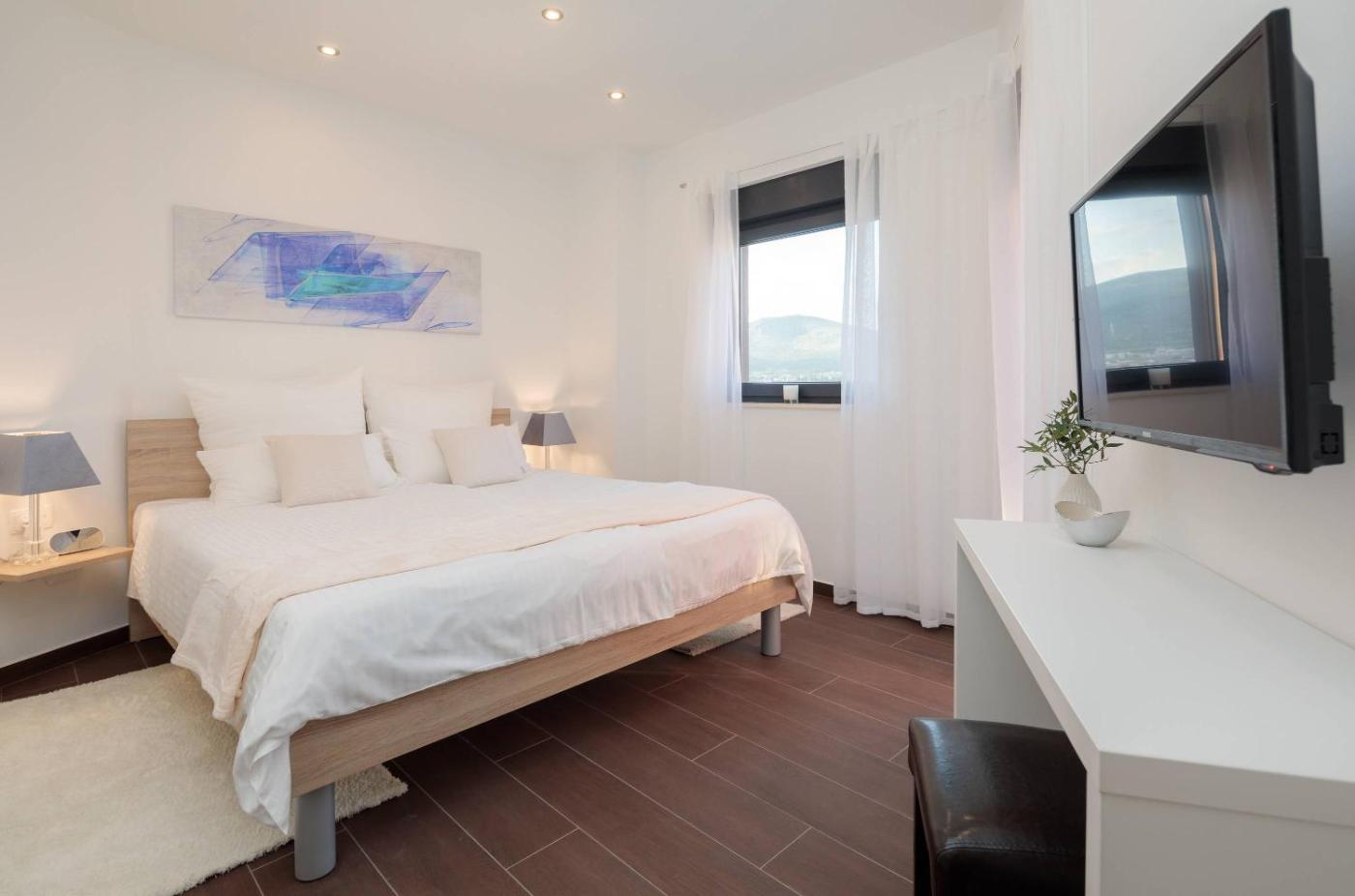 Willa z prywatnym basenem. Goście mogą zrelaksować się na dużym tarasie, a basen jest osłonięty przez dużą ścianę i śródziemnomorską roślinność. Goście mogą zrelaksować się przy koktajlu na leżaku, podziwiając widok na Stare Miasto w Trogirze i morze. Wnętrza willi urządzone zostały w minimalistycznym stylu, który podkreśla luksus i świeżość. Wystrój willi inspirowany jest ciemnymi i białymi czekoladkami lub kawą ze śmietaną. Wnętrza utrzymane są w przyjemnych kolorach – brązowe kolory zapewniają komfort i poczucie bezpieczeństwa, a wszystkie kombinacje odcieni brązu, beżu i bieli tworzą przytulną i odprężającą atmosferę. W salonie znajduje się narożna sofa oraz telewizor z płaskim ekranem. Z otwartej kuchni roztacza się widok na stół. Do dyspozycji Gości jest w pełni wyposażona kuchnia ze zmywarką do naczyń i ekspresem do kawy. Otwarta przestrzeń otwiera się na piękny balkon ze stołem, przy którym można zjeść posiłek z grilla, podziwiając wspaniałe zachody słońca. Willa obejmuje 4 zaciszne sypialnie, które mogą pomieścić maksymalnie 8 osób. Wszystkie z nich są wyposażone w łóżko typu king-size (180 x 210 cm), klimatyzację oraz telewizor z dostępem do kanałów satelitarnych i obejmują łazienkę z prysznicem. Dodatkowe 2 osoby mogą spać na rozkładanej narożnej sofie w salonie. Ta otoczona śródziemnomorską roślinnością willa dysponuje tarasami wyposażonymi w wygodne leżaki. Na parterze znajduje się taras i basen, które stanowią doskonałe miejsce do zabawy dla dzieci i dorosłych. Do dyspozycji Gości jest stół, przy którym można zjeść codzienny posiłek. Ta piękna chorwacka willa stanowi doskonałe miejsce na niezapomniany pobyt. Willa - 10 osobowy. Powierzchnia pokoju ok.: 237 mkw.