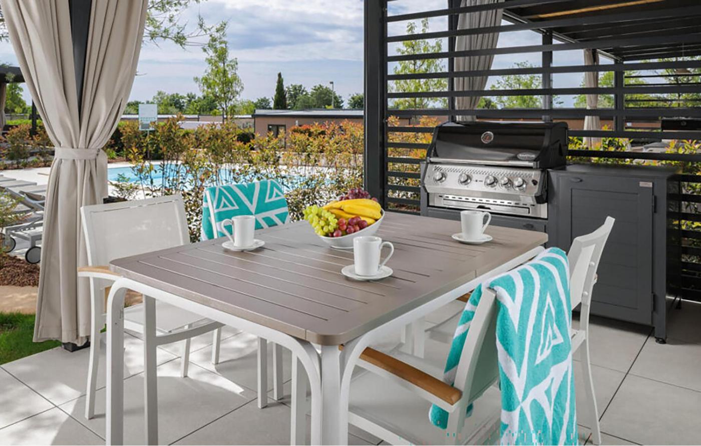 Mobile Home. Boasting a private entrance, this air-conditioned mobile home features 1 living room, 2 separate bedrooms and 2 bathrooms with a shower. Guests will find a stovetop, a refrigerator, a dishwasher and kitchenware in the well-fitted kitchen. The mobile home also comes with a barbecue. This mobile home has a tea and coffee maker, a dining area, a TV and outdoor furniture. The unit has 3 beds and 1 futon.