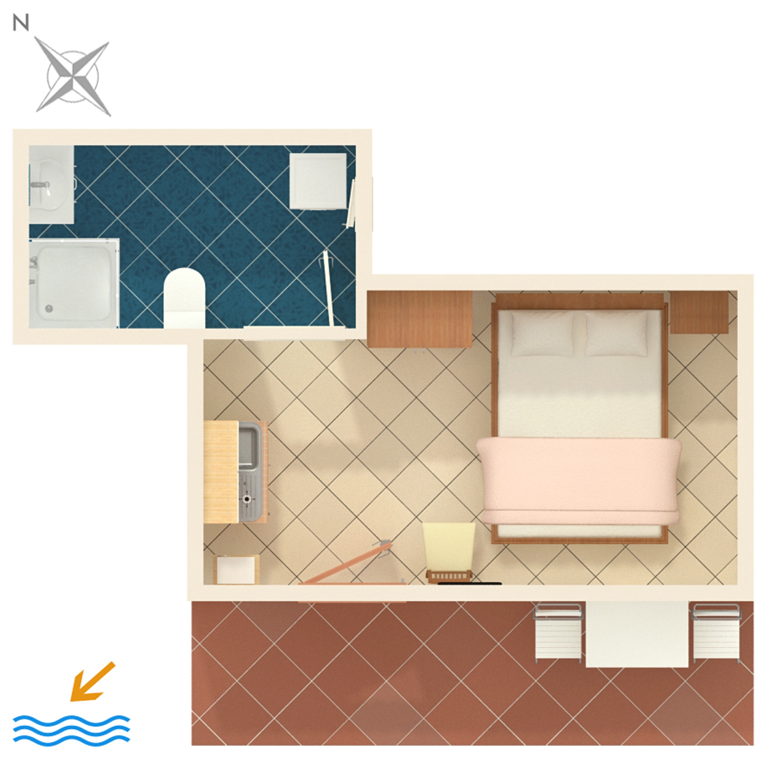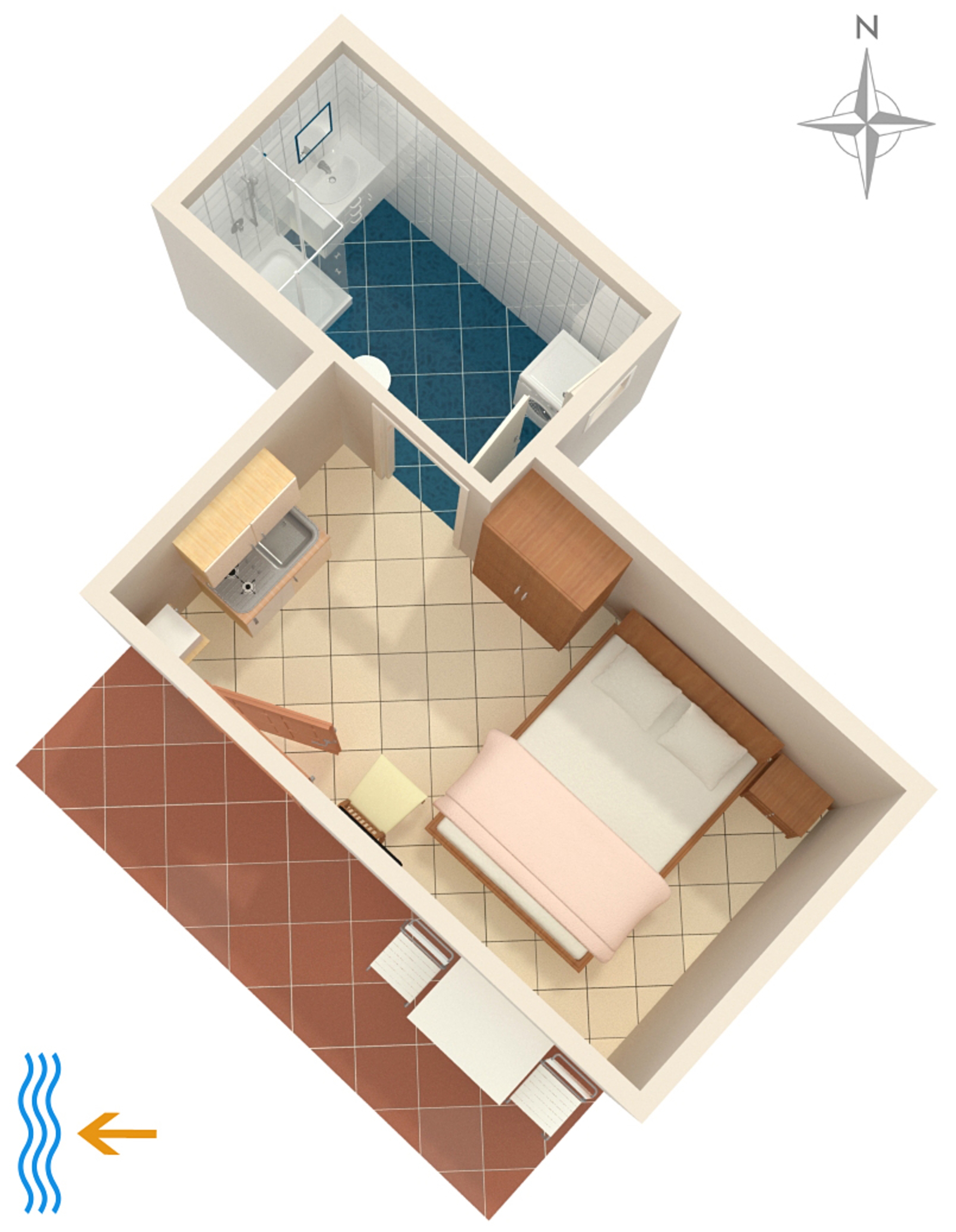 Studio może przyjąć 2 gości. Łóżka znajdują się w sypialniach, których jest 1, na powierzchni 14m2. Goście mają dostęp do tarasu, by korzystać z ciepłych, letnich wieczorów. Możliwość przygotowywania posiłków poprzez korzystanie ze wspólnego grilla. Przez taras rezerwowanej kwatery przechodzą także inni goście lub gospodarze. WLICZONE W CENĘ: taksa pobytowa, sprzątanie końcowe, klimatyzacja, parking, internet, pranie bielizny, żelazko, deska do prasowania, suszarka do włosów. OBOWIĄZKOWE KOSZTY DODATKOWE: dopłata za krótki termin (procent dopłaty w zalezności od liczby noclegów: 30% - 1, 20% - 2, 10% - 3). Dostępność dodatkowych usług w rezerwowanym terminie oraz ich cenę (jeśli nie jest podana) należy sprawdzić wcześniej. Za dodatowe usługi, które nie zostały uwzględnione w kalkulacji ceny, płaci się bezpośrednio właścicielowi obiektu, pod warunkiem śe gość korzysta z tych usług. Zniżki od ceny podstawowej: bezpłatny dzień 14=13 (przy pobycie, trwającym co najmniej 14 dni, otrzymujecie jeden bezpłatny dzień na pobyt do 31.12.2026).