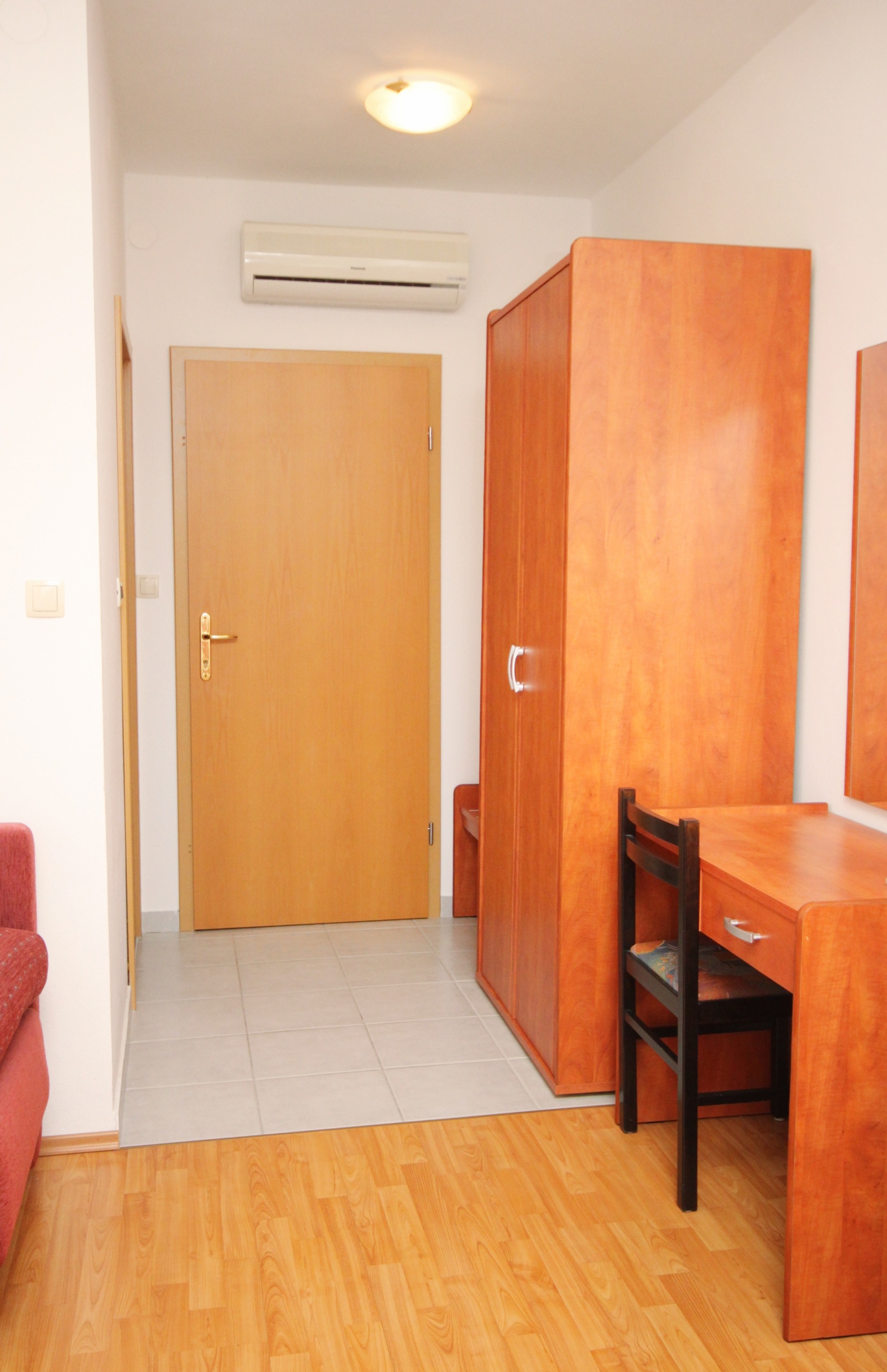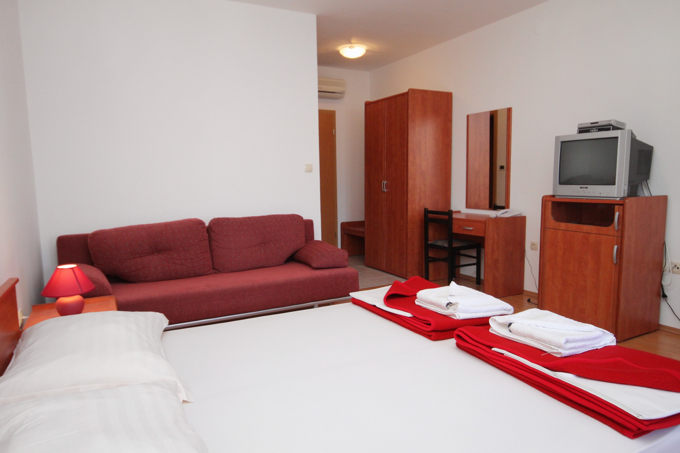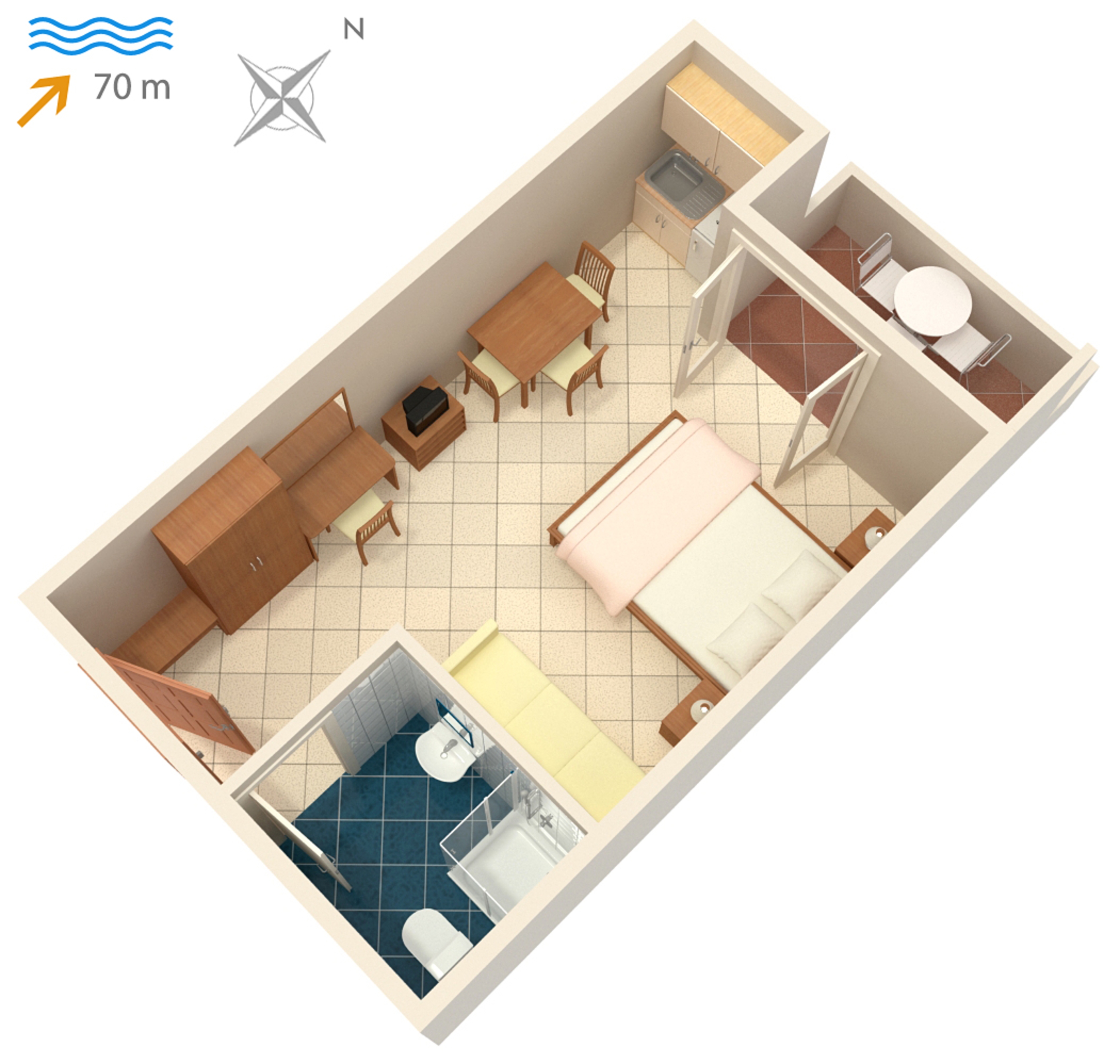 Studio może przyjąć 3 gości. Łóżka znajdują się w sypialniach, których jest 1, na powierzchni 26m2. Goście mają dostęp do tarasu, by korzystać z ciepłych, letnich wieczorów. Z apartamentu typu studio roztacza się widok na morze. W kwaterze dozwolony jest pobyt zwierzęcia domowego, za dopłatą. WLICZONE W CENĘ: sprzątanie końcowe, klimatyzacja, parking, internet, pranie bielizny, łóżeczko dziecięce, żelazko, deska do prasowania, suszarka do włosów. OBOWIĄZKOWE KOSZTY DODATKOWE: taksa pobytowa (dorośli 0,93 € - 1,50 € noclegosoba, zniżka dla dzieci w wieku 12 - 17 lat), dopłata za krótki termin (procent dopłaty w zalezności od liczby noclegów: 30% - 1, 20% - 2, 10% - 3). NIEOBOWIĄZKOWE KOSZTY DODATKOWE: śniadanie (13,00 €, 50% zniżki dla dzieci od 4 do 12 lat, Bezpłatne dla dzieci do 4 lat), śniadanie i kolacja (40,00 €, 50% zniżki dla dzieci od 4 do 12 lat, Bezpłatne dla dzieci do 4 lat), zwierzęta domowe (3,00 € za nocleg). Dostępność dodatkowych usług w rezerwowanym terminie oraz ich cenę (jeśli nie jest podana) należy sprawdzić wcześniej. Za dodatowe usługi, które nie zostały uwzględnione w kalkulacji ceny, płaci się bezpośrednio właścicielowi obiektu, pod warunkiem śe gość korzysta z tych usług.