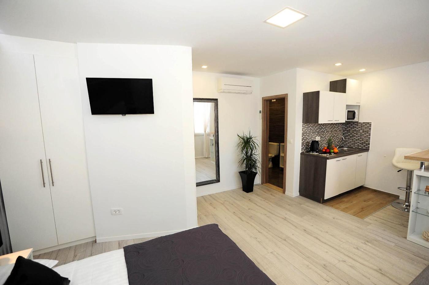 Apartament typu studio. Boasting a private entrance, this air-conditioned apartment comes with a kitchen, 1 bedroom and 1 bathroom with a shower and a hairdryer. Guests can make meals in the kitchen that features a stovetop, a refrigerator, kitchenware and a microwave. The apartment features soundproof walls, a tea and coffee maker, a seating area, a flat-screen TV with cable channels, as well as city views. The unit has 2 beds. Apartament - 3 osobowy. Powierzchnia pokoju ok.: 29 mkw.